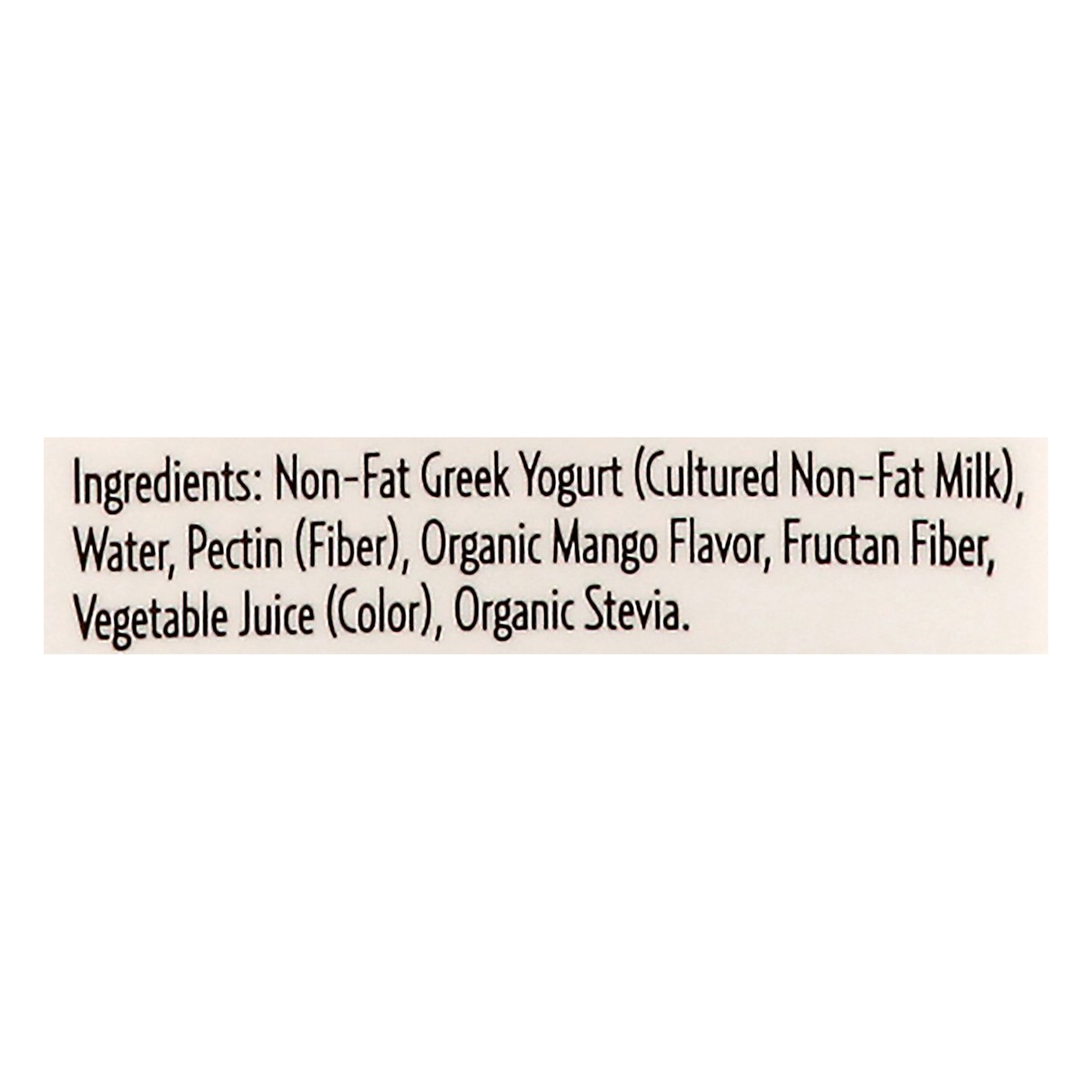 Non-Fat Greek Yogurt (Cultured Non-Fat Milk), Water, Pectin (Fiber), Organic Mango Flavor, Fructan Fiber, Vegetable Juice (Color), Organic Stevia. Live & Active Cultures: S. Thermophilus, L. Bulgaricu…