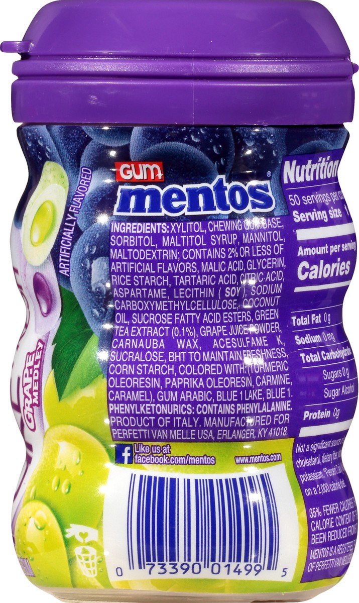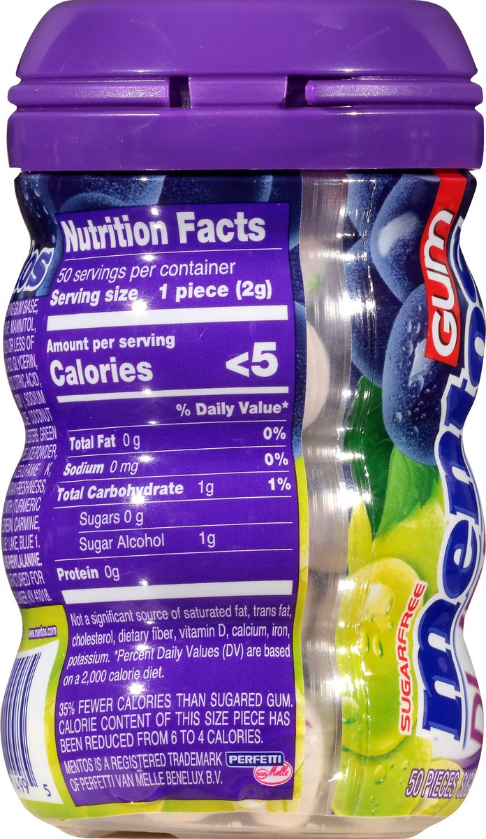 Artificially flavored. Sugar free. 35% fewer calories than sugared gum. Calorie content of this size piece has been reduced from 6 to 4 calories. www.mentos.com. Like us at: facebook.com/mentos. Dispo…