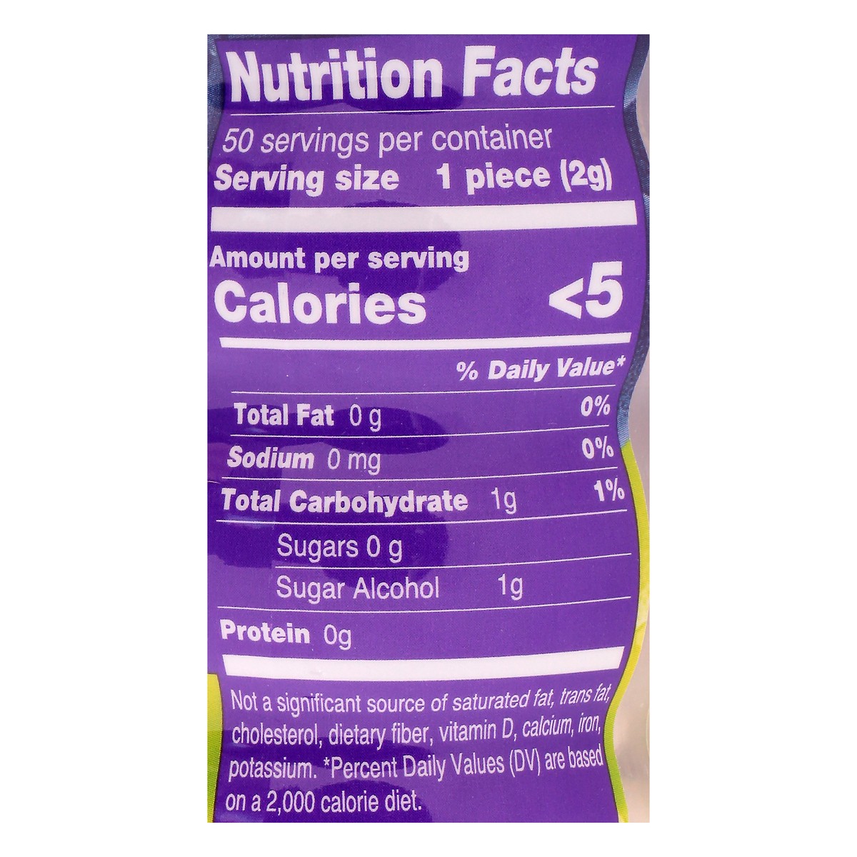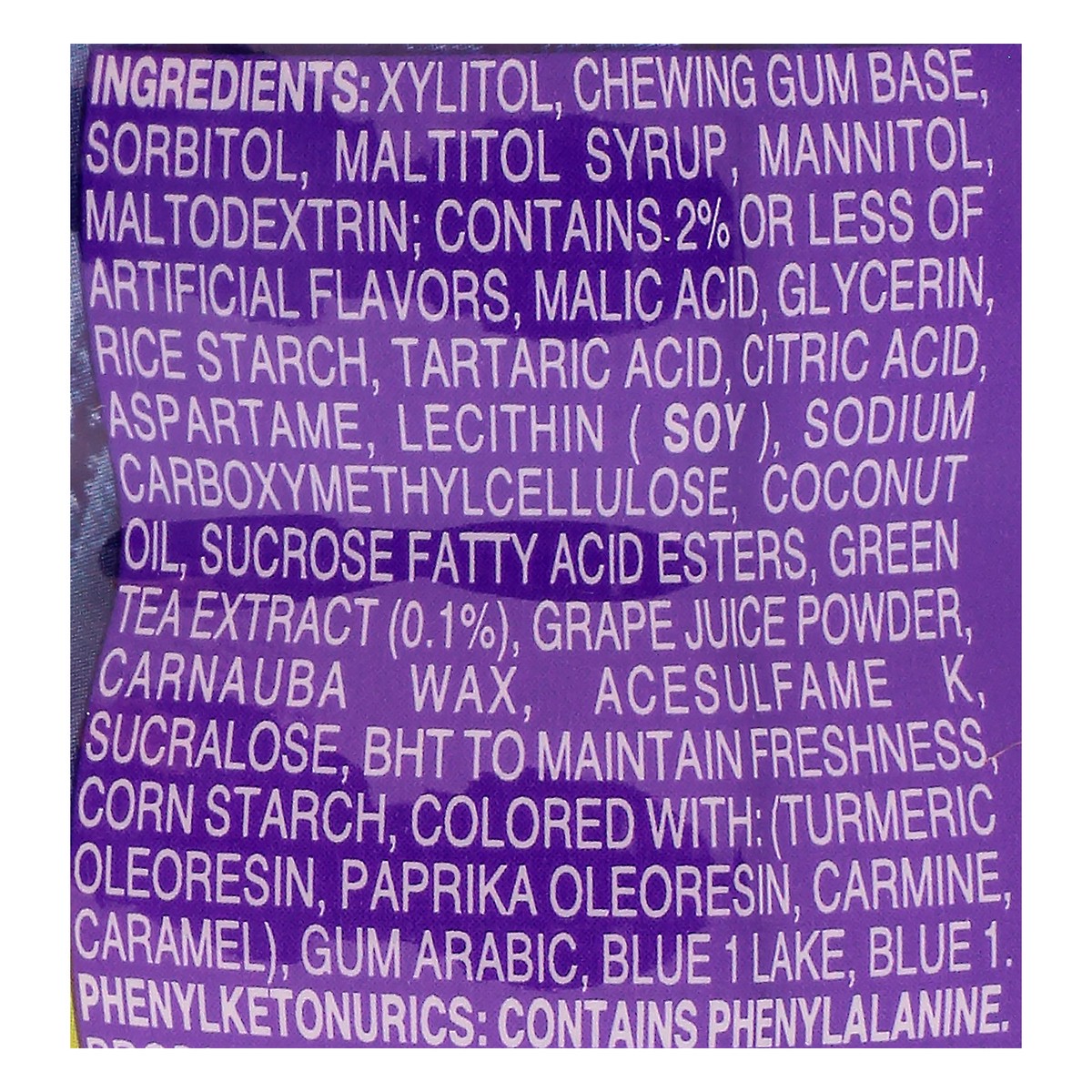 Xylitol, Chewing Gum Base, Sorbitol, Maltitol Syrup, Mannitol, Maltodextrin; Contains 2% or Less of Artificial Flavors, Malic Acid, Glycerin, Rice Starch, Tartaric Acid, Citric Acid, Aspartame, Lecith…