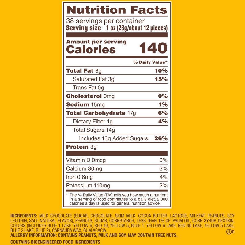Milk Chocolate (Sugar, Chocolate, Skim Milk, Cocoa Butter, Lactose, Milkfat, Peanuts, Soy Lecithin, Salt, Natural Flavor), Peanuts, Sugar, Cornstarch; Less than 1% of: Palm Oil, Corn Syrup, Dextrin Co…