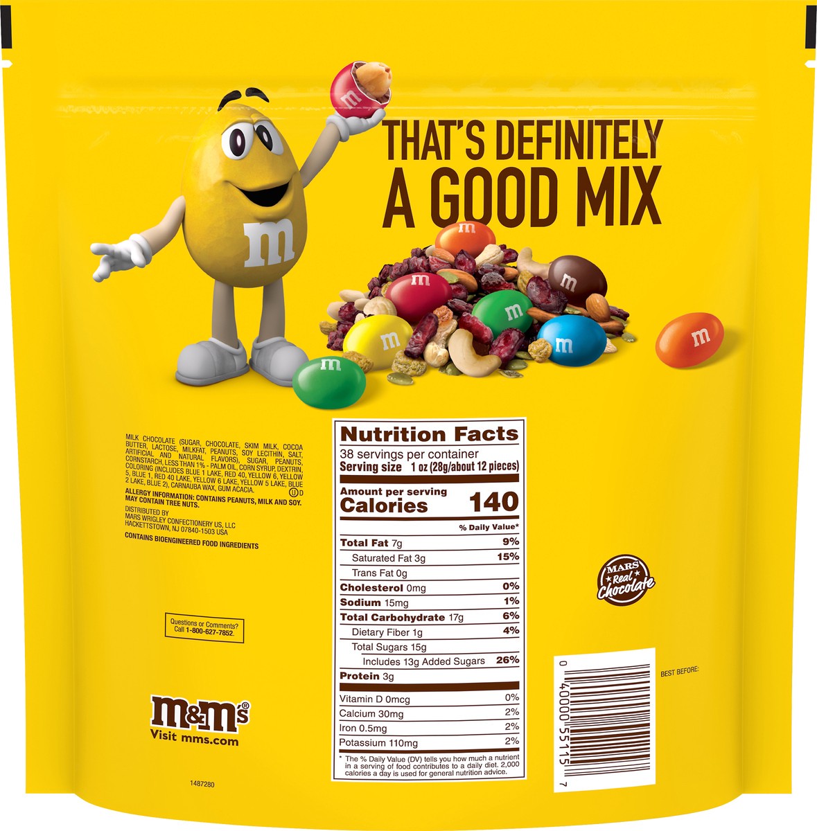 Per Serving: 140 calories; 3 g sat fat (15% DV); 15 mg sodium (1% DV); 15 g total sugars. Contains bioengineered food ingredients. 38 servings per pack. That''s definitely a good mix. Mars real chocol…