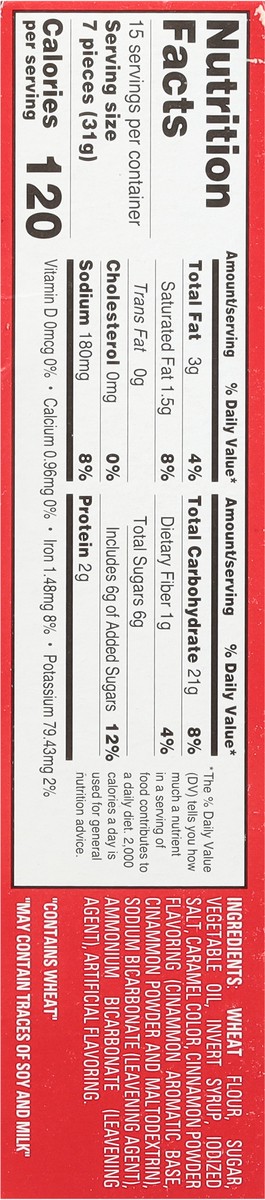 Wheat Flour, Sugar, Vegetable Oil, Invert Syrup, Iodized Salt, Caramel Color, Cinnamon Powder Flavoring (Cinammon Aromatic Base, Cinammon Powder and Maltodextrin), Sodium Bicarbonate (Leavening Agent)…