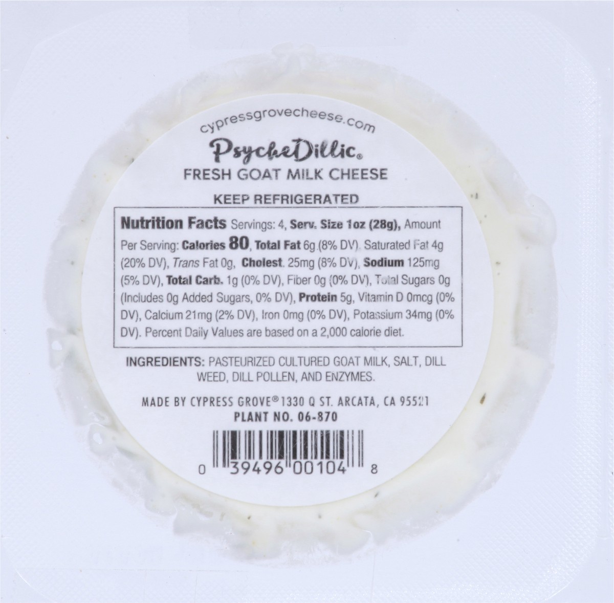 Pasteurized Cultured Goat Milk, Salt, Dill Weed, Dill Pollen, and Enzymes.