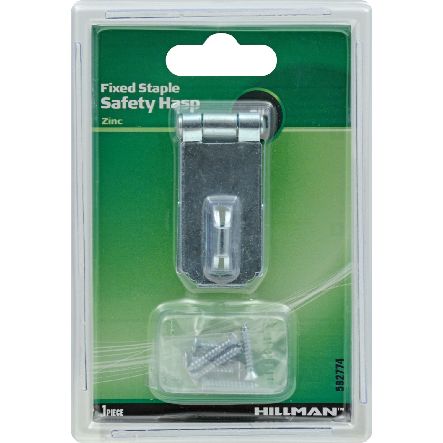 Hillman fixed staple safety hasps are ideal security devices for doors, cabinets, and gates. Rigid, fixed staple is non-swiveling for strength. Package includes instructions and all mounting hardware.