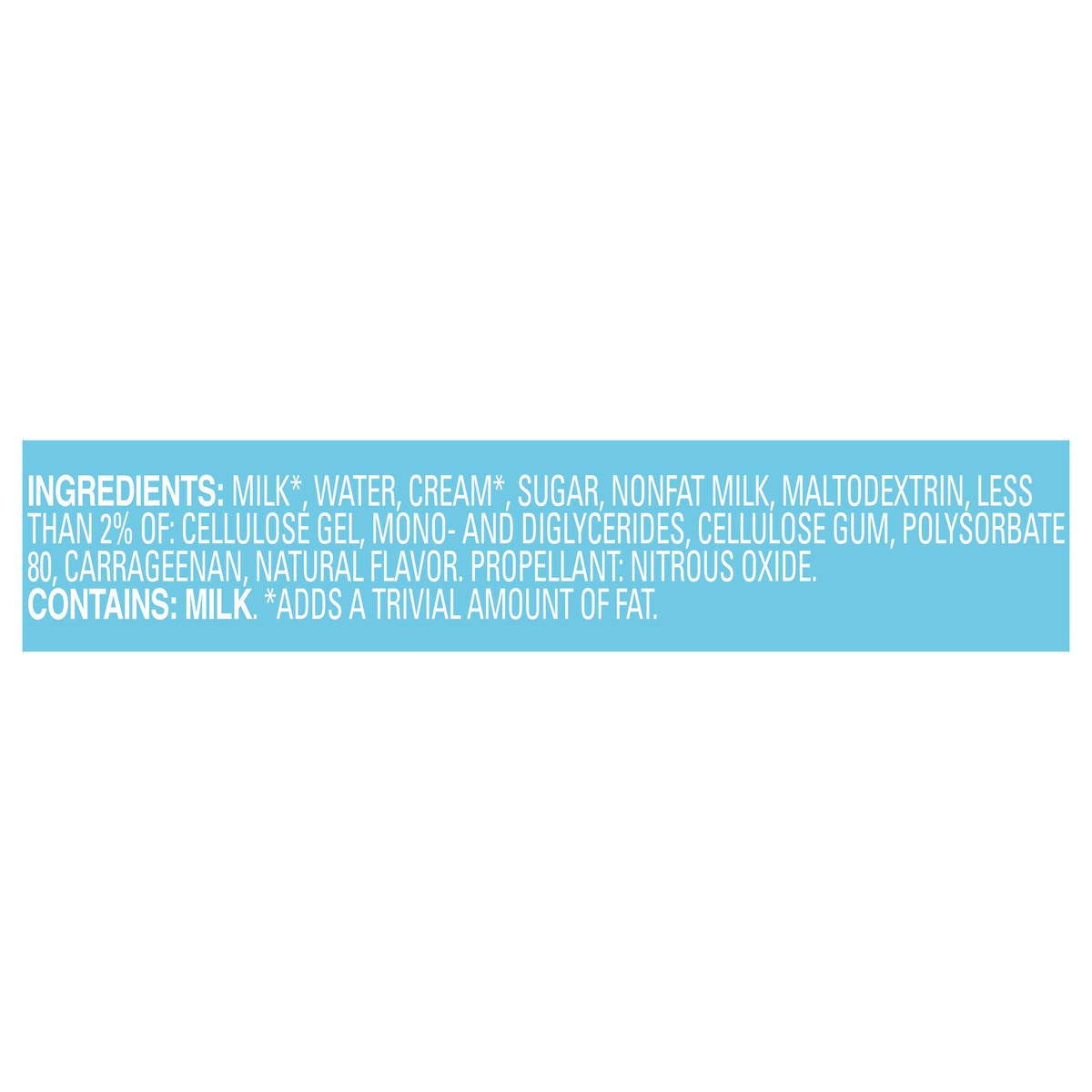 Milk*, Water, Cream*, Sugar, Nonfat Milk, Maltodextrin, Less than 2% of: Cellulose Gel, Mono- and Diglycerides, Cellulose Gum, Polysorbate 80, Carrageenan, Natural Flavor, Propellant: Nitrous Oxide, *…