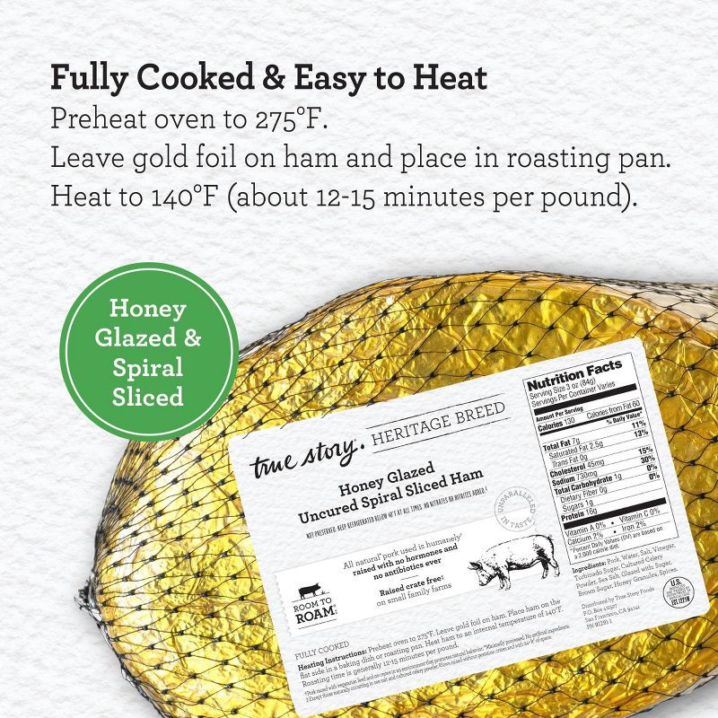 Serve something you can feel good about with True Story Foods Heritage Breed Spiral Cut Ham. Made with high-quality pork raised without antibiotics and crafted with simple ingredients, this fully cook…