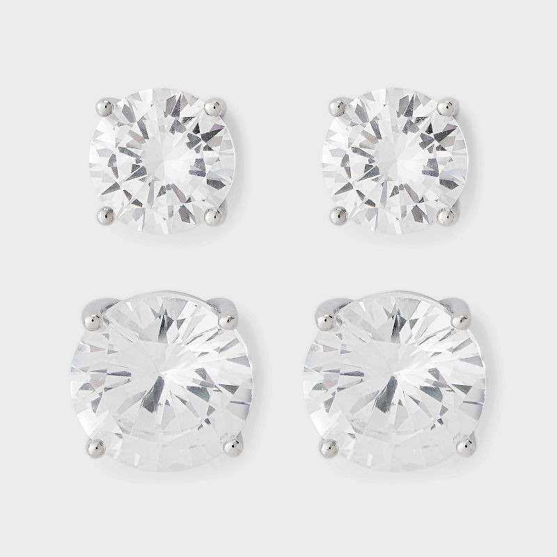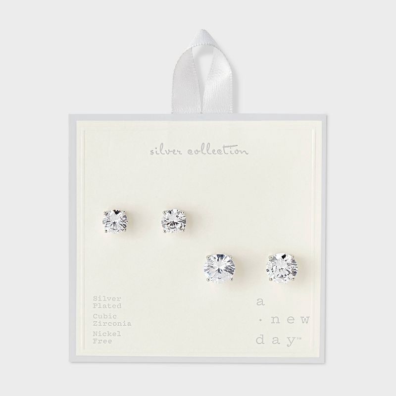 This 2-Piece Silver-Plated Cubic Zirconia Round Stud Post Earring Set from a New Day™ adds two elegant pairs to your earring assortment. These stud earrings are designed with silver-plated frames inse…