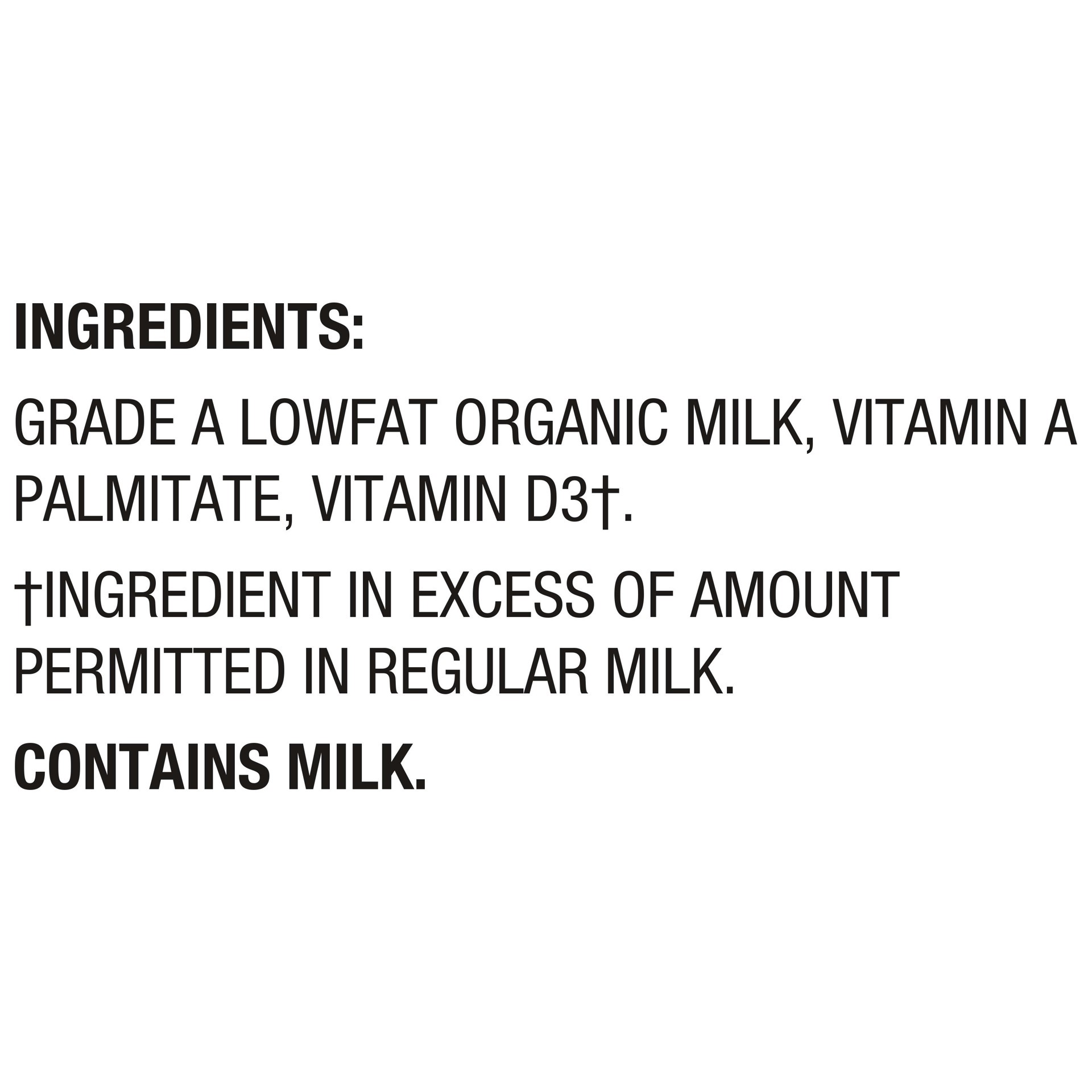 Grade A Lowfat Organic Milk, Vitamin A Palmitate, Vitamin D3 (Ingredient in Excess of Amount Permitted in Regular Milk).