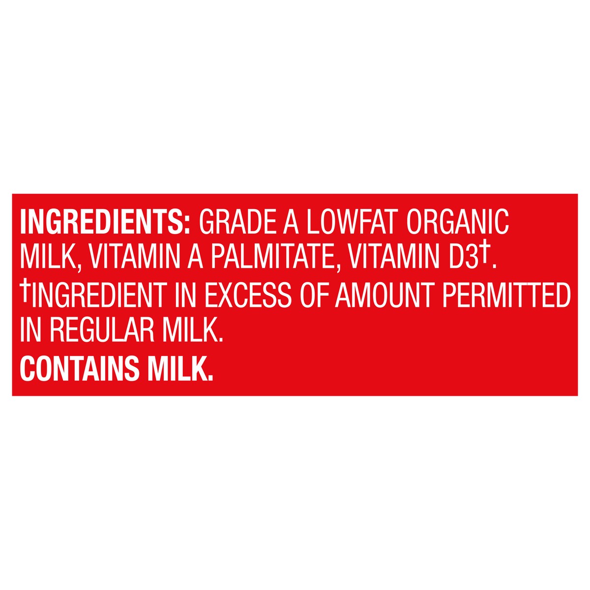 Grade A Lowfat Organic Milk, Vitamin A Palmitate, Vitamin D3 (Ingredient in Excess of Amount Permitted in Regular Milk).