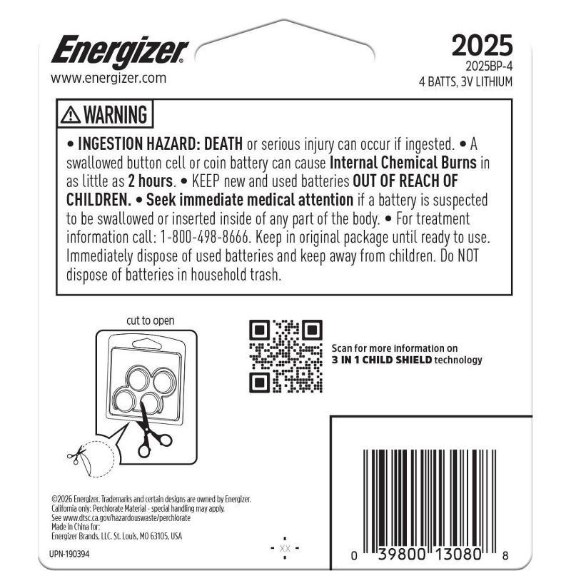 - 4 pack of Energizer 2025 Batteries, 3V Lithium Coin Batteries