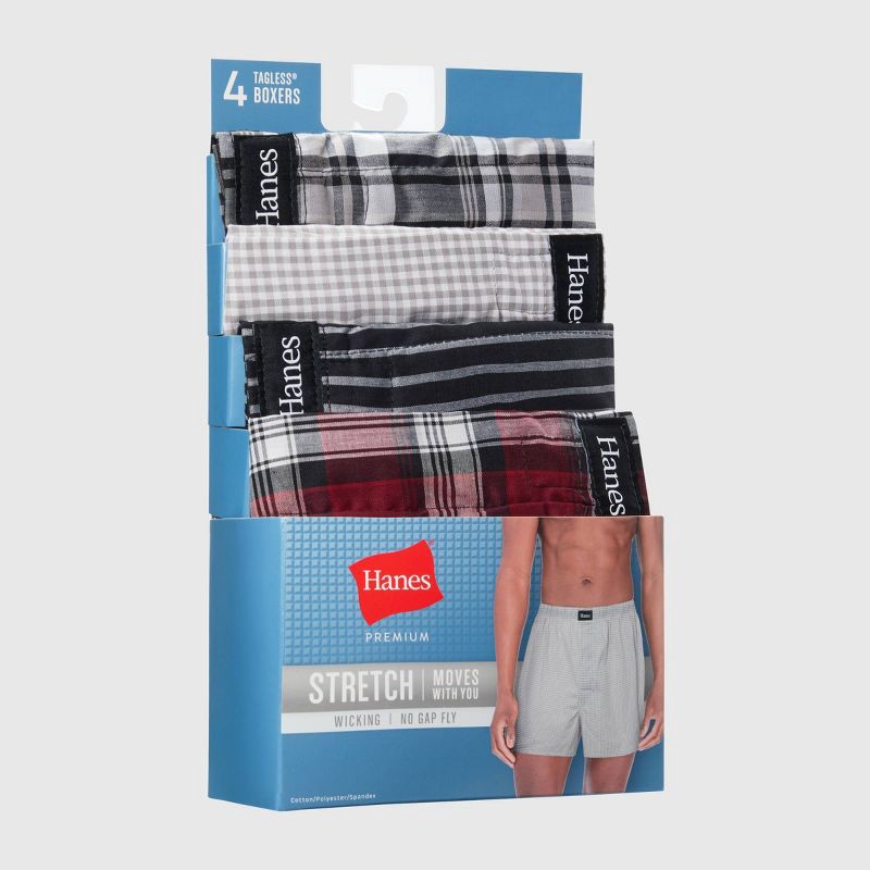 Upgrade your everyday men's underewear essentials with the Hanes Premium Men's Stretch Woven Boxer Shorts 4pk. Designed with a modern fit, these Hanes boxers offer all-day comfort and freedom of movem…