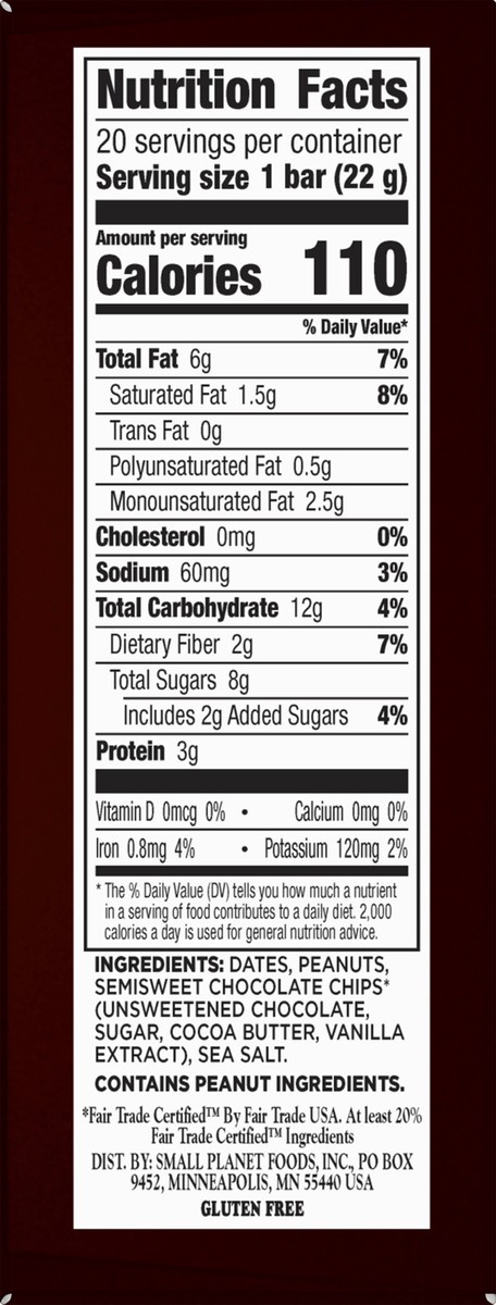 Dates, Peanuts, Semisweet Chocolate Chips* (Unsweetened Chocolate, Sugar, Cocoa Butter, Vanilla Extract), Sea Salt. * Fair Trade Certified, at Least 20% Fair Trade Certified Ingredients.
