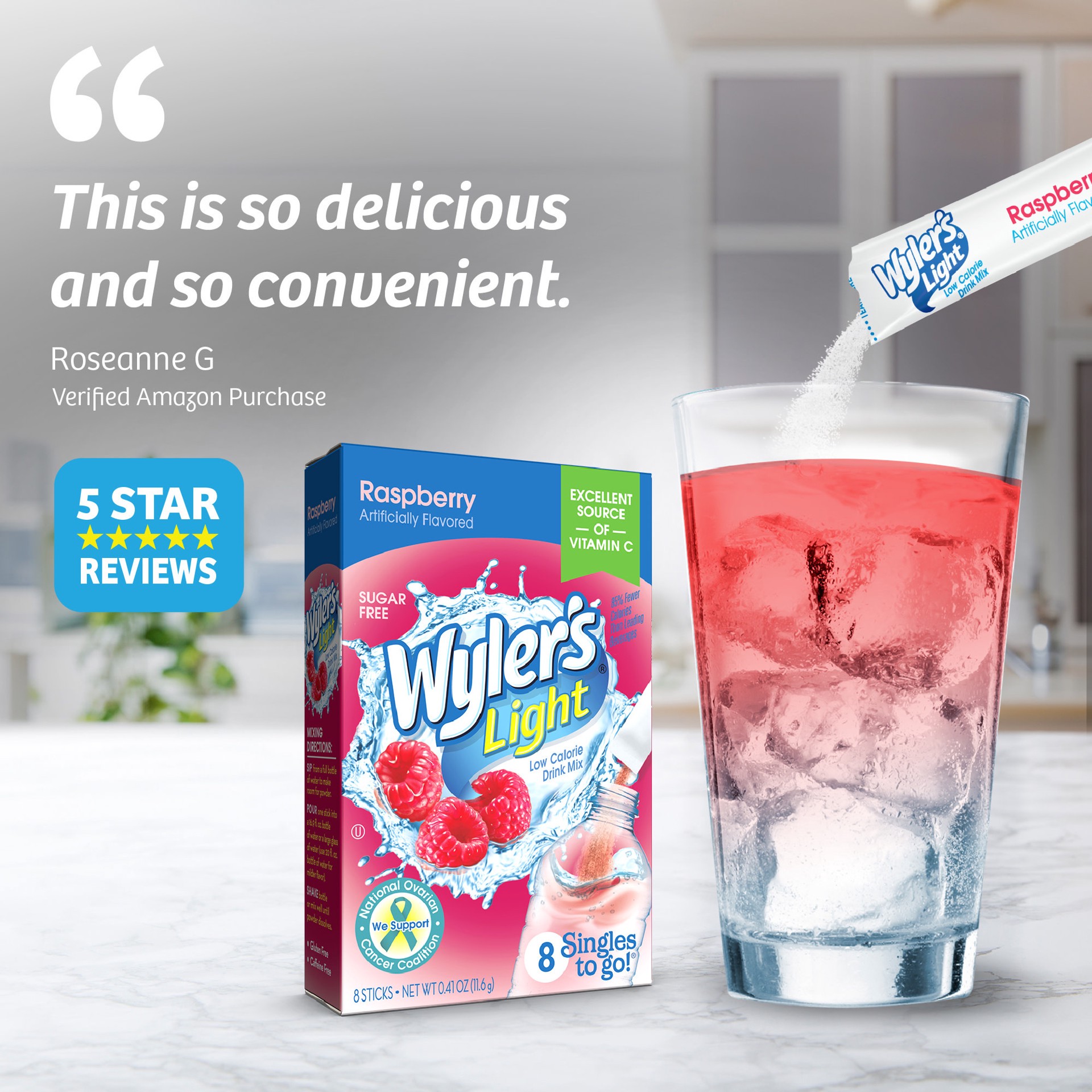 Caffeine free. Great taste! 0 g carbs, 5 calories per serving. Natural flavor. Wyler's Light has only 5 calories; leading soft drink mixes - 70 calories. Add to bottled water. Now you can take the ref…