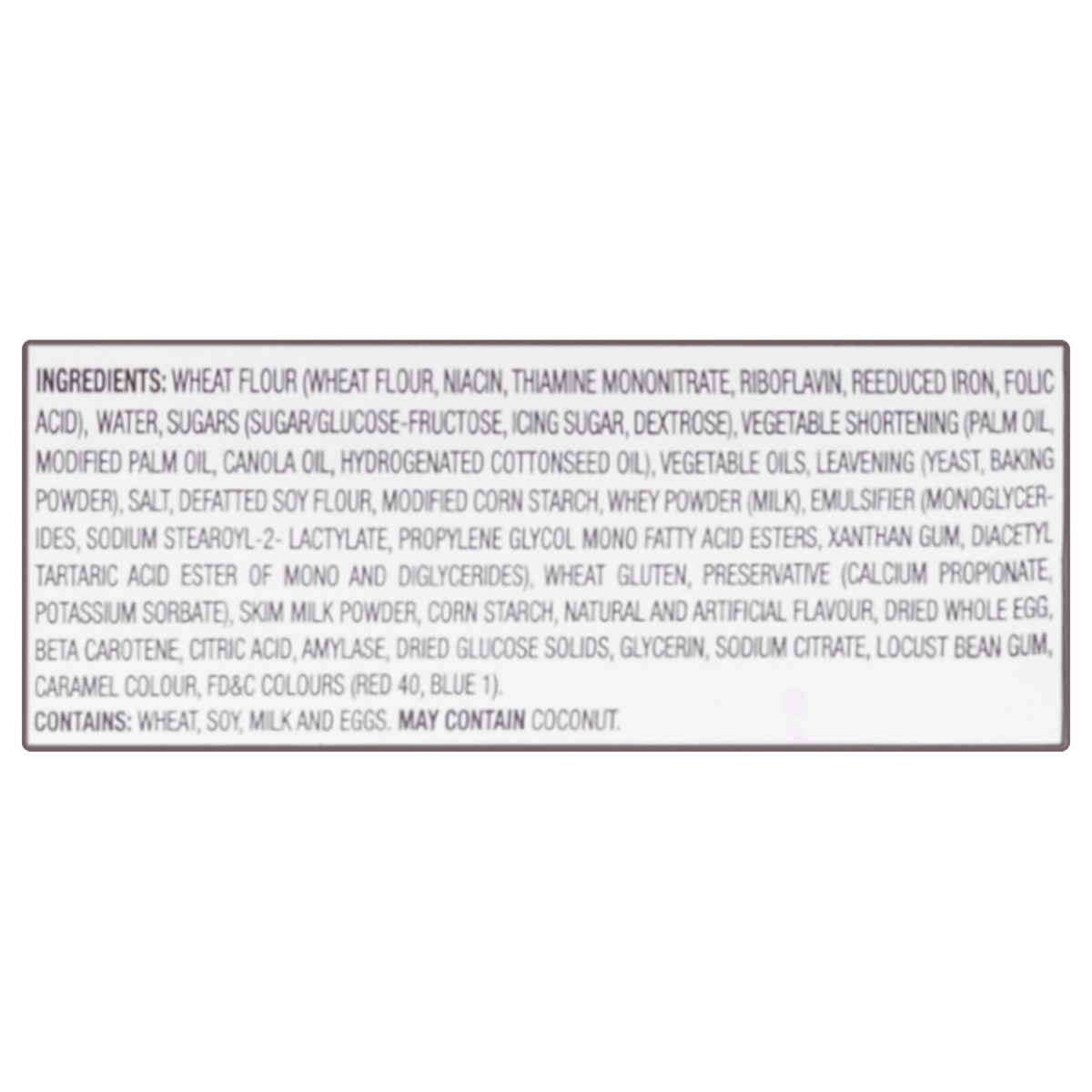 Wheat Flour (Wheat Flour, Niacin, Thiamine Mononitrate, Riboflavin, Reeduced Iron, Folic Acid), Water, Sugars (Sugar/Glucose-Fructose, Icing Sugar, Dextrose), Vegetable Shortening (Palm Oil, Modified …