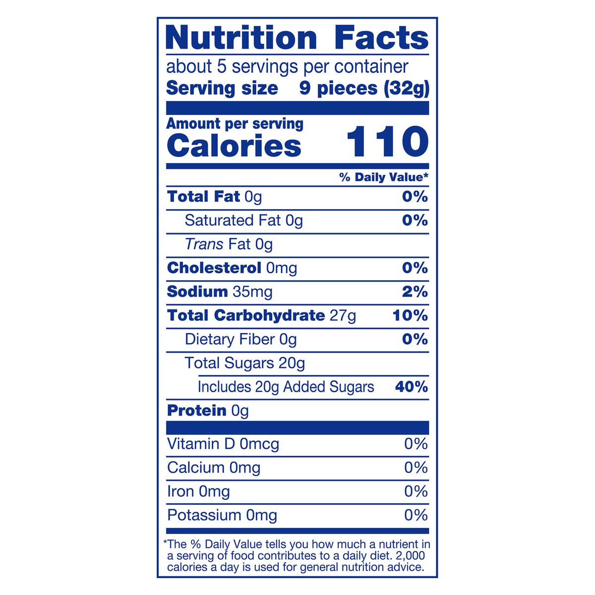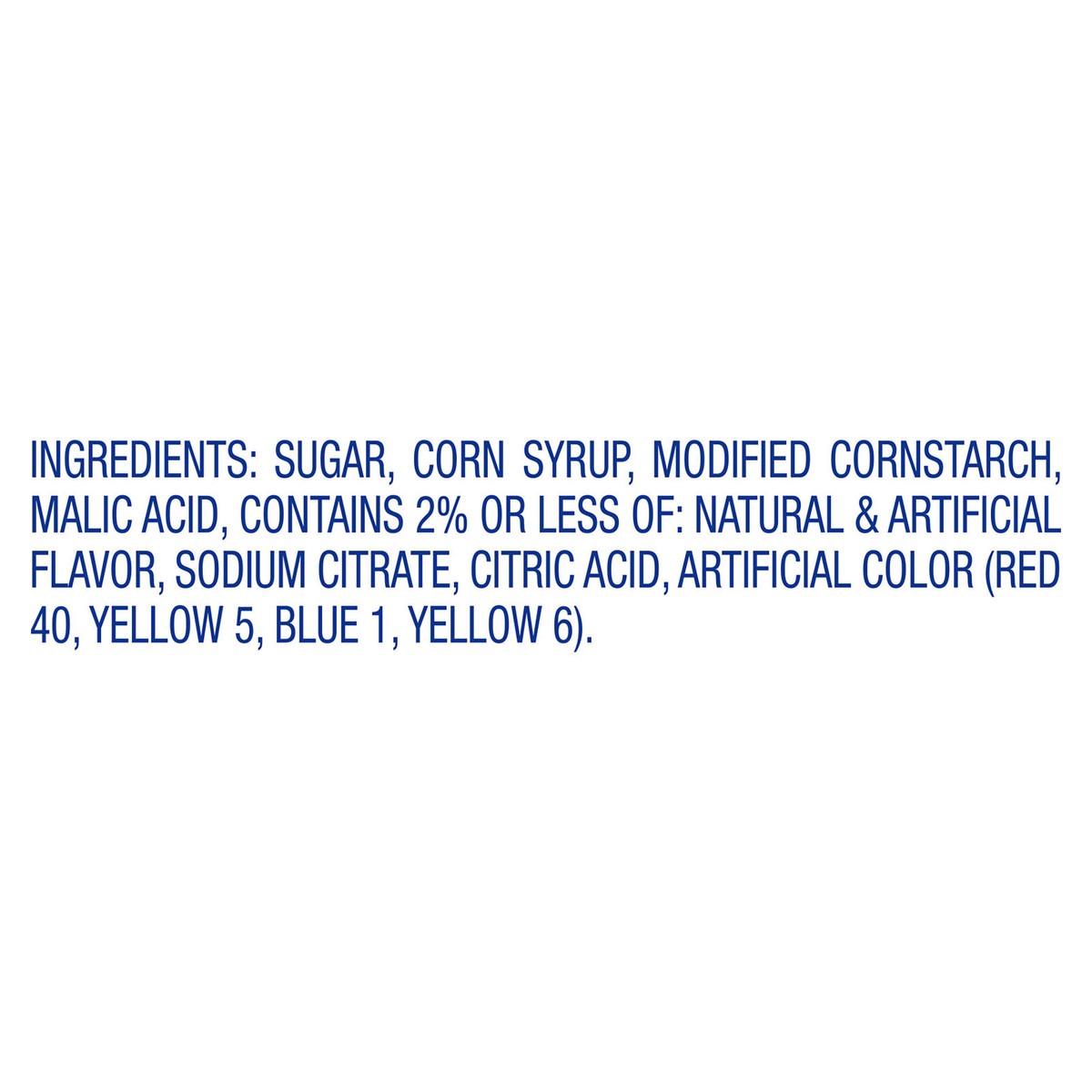 Sugar, Corn Syrup, Modified Cornstarch, Malic Acid, Contains 2% or Less of: Natural & Artificial Flavor, Sodium Citrate, Citric Acid, Artificial Color (Red 40, Yellow 5, Blue 1, Yellow 6).