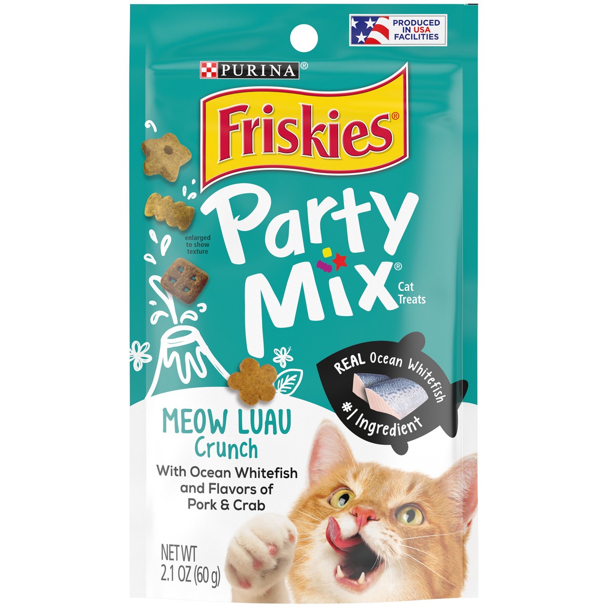 - Purina Friskies Party Mix Meow Luau Crunch adult treats for cats crafted in Purina-owned U.S. facilities