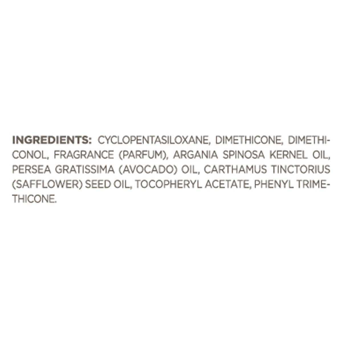 Cyclopentasiloxane, Dimethicone, Dimethiconol, Fragrance (Parfum), Argania Spinosa Kernel Oil, Persea Gratissima (Avocado) Oil, Carthamus Tinctorius (Safflower) Seed Oil, Tocopheryl Acetate, Phenyl Tr…