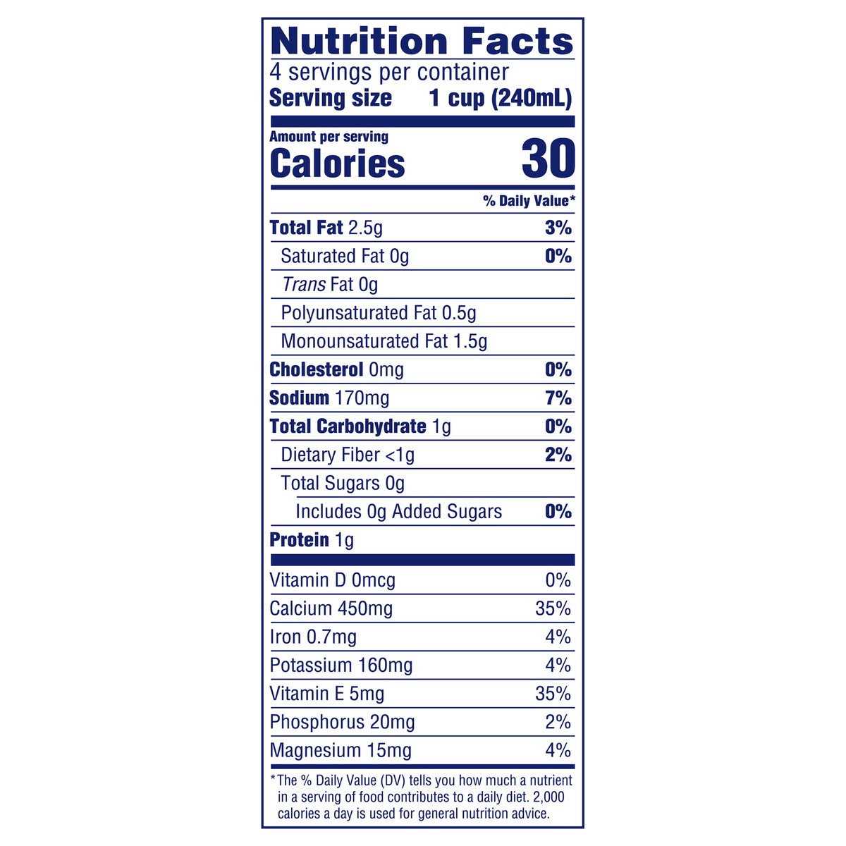 ALMONDMILK (FILTERED WATER, ALMONDS), CALCIUM CARBONATE, SEA SALT, POTASSIUM CITRATE, SUNFLOWER LECITHIN, GELLAN GUM, NATURAL FLAVORS, D-ALPHA-TOCOPHEROL (NATURAL VITAMIN E).