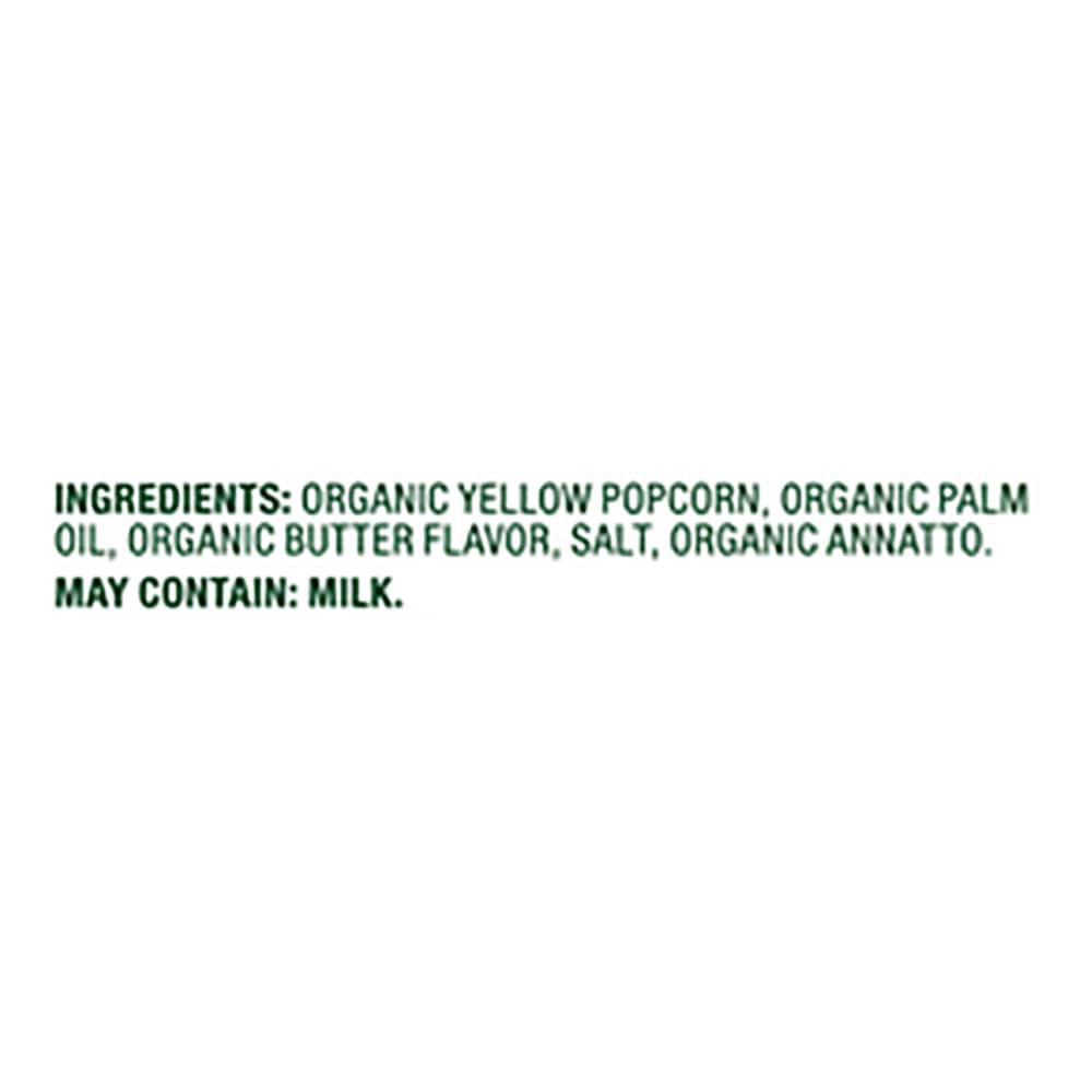 Ingredients: Organic Yellow Popcorn, Organic Palm Oil, Organic Butter Flavor, Salt, Organic Annatto.