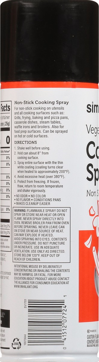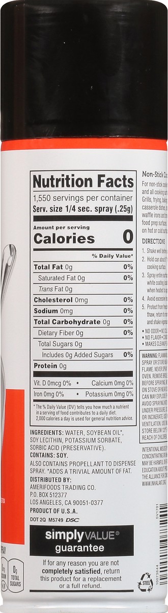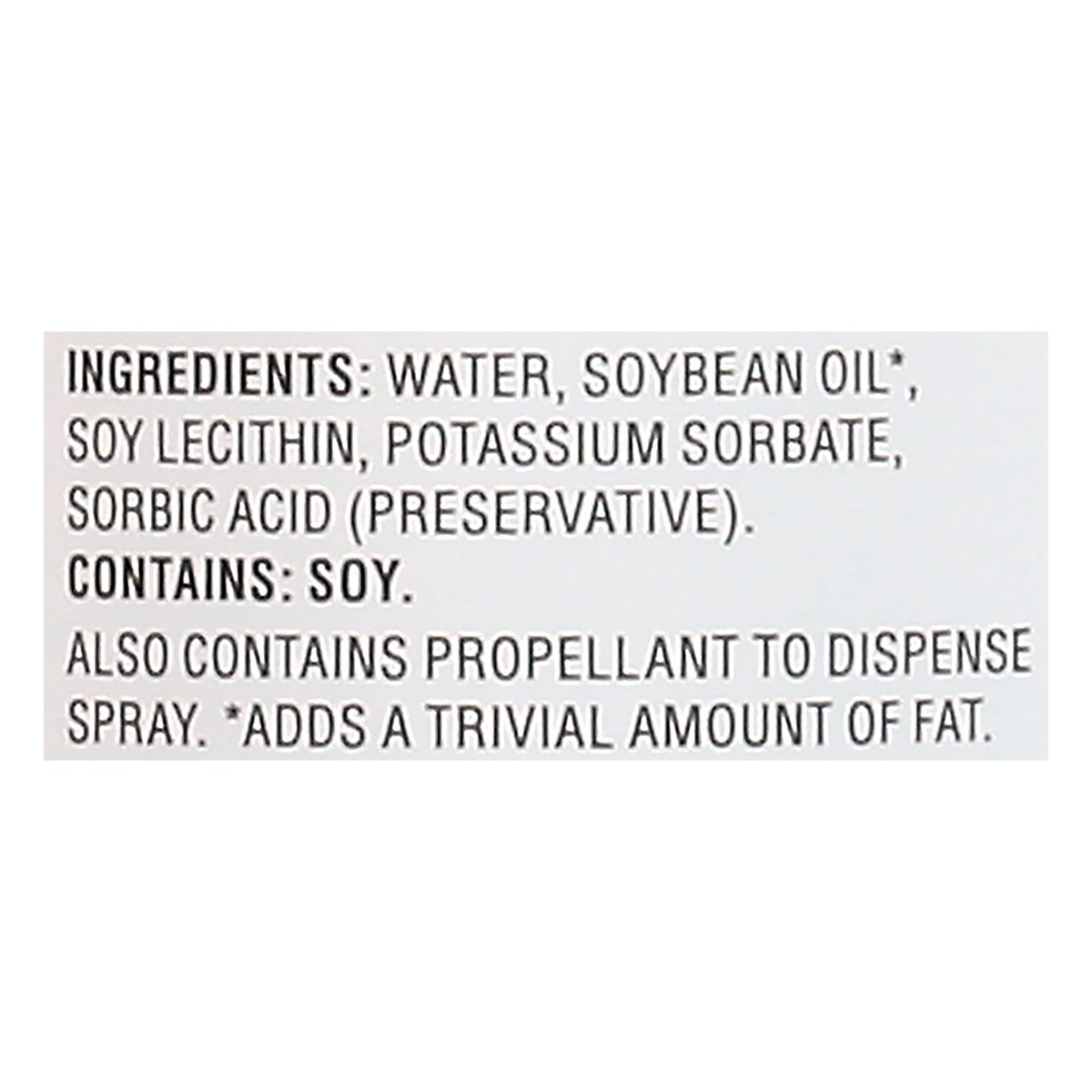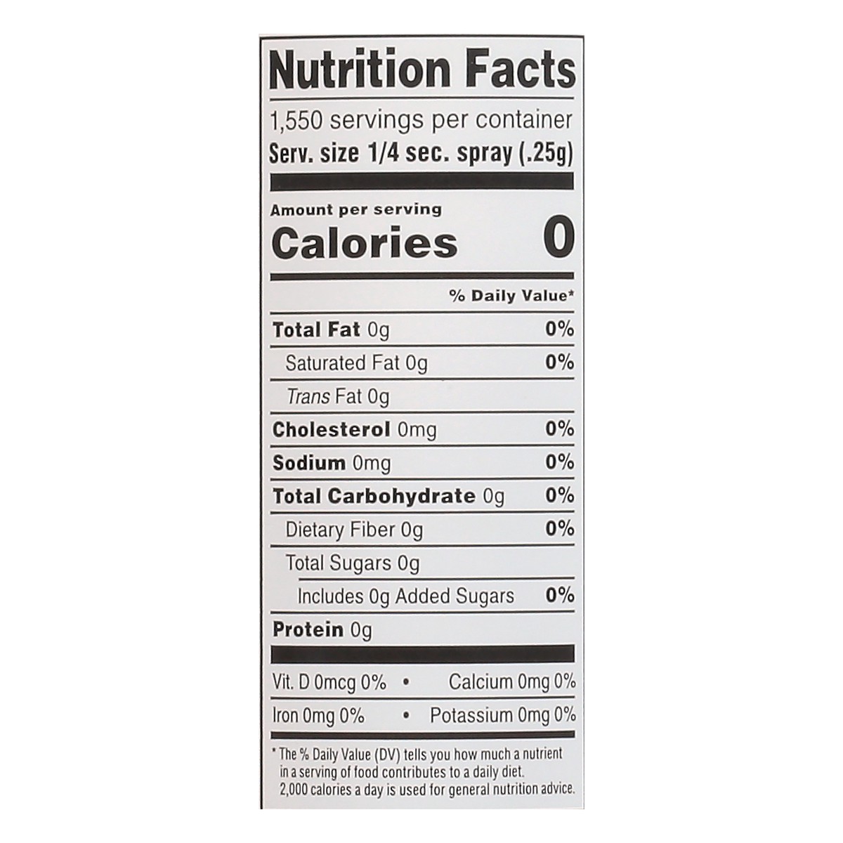 Per 1/4 Second Spray: 0 Calories; 0 g sat fat (0% DV); 0 mg sodium (0% DV); 0 g total sugars. Non-Stick Cooking Spray: For non-stick cooking on utensils and all cooking surfaces such as: Grills, fryin…