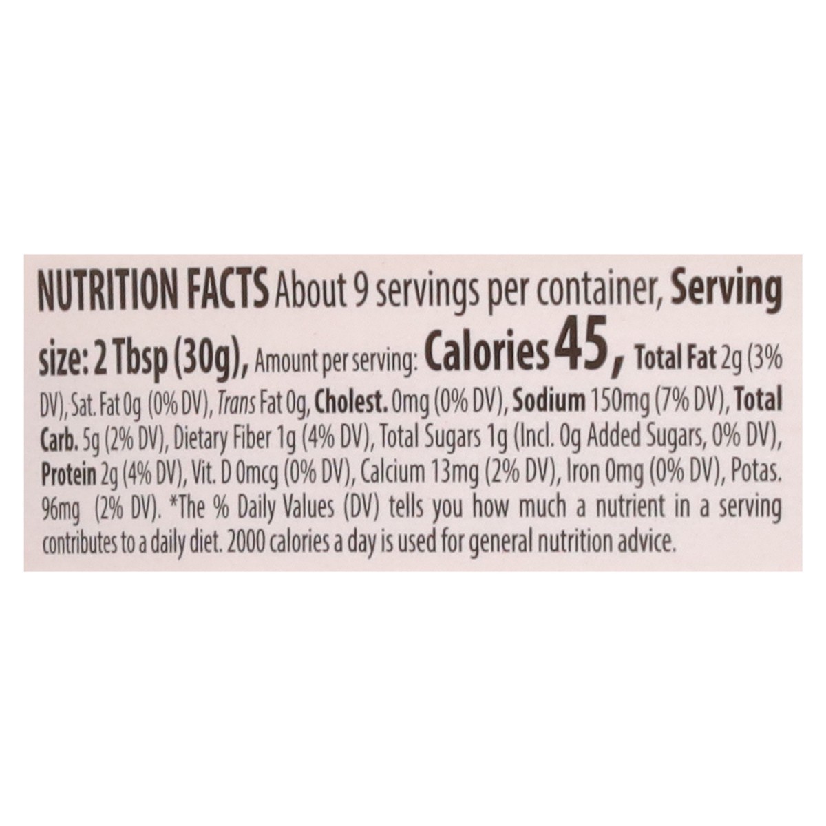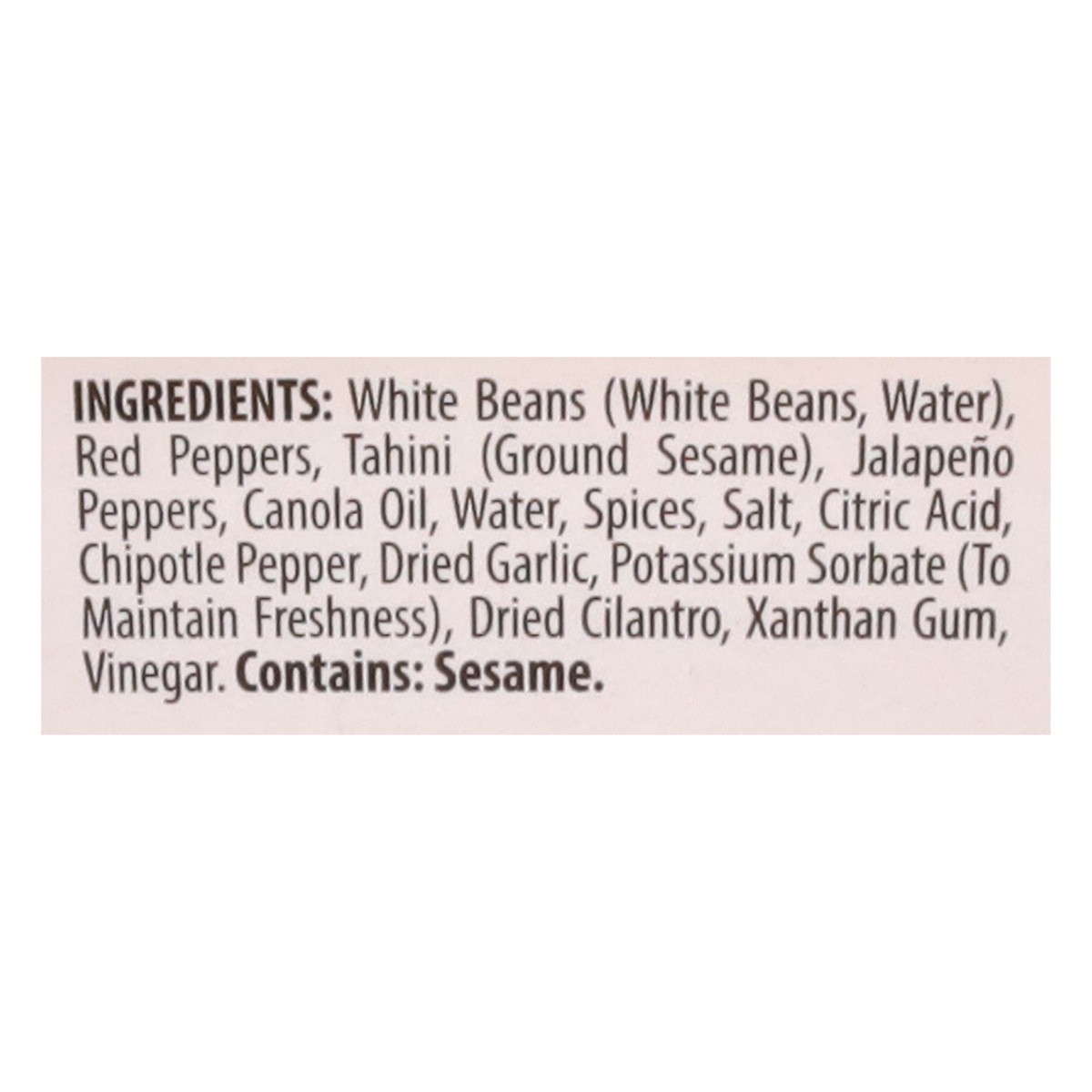 White Beans (White Beans, Water), Red Peppers, Tahini (Ground Sesame), Jalapeno Peppers, Canola Oil, Water, Spices, Salt, Citric Acid, Chipotle Pepper, Dried Garlic, Potassium Sorbate (to Maintain Fre…