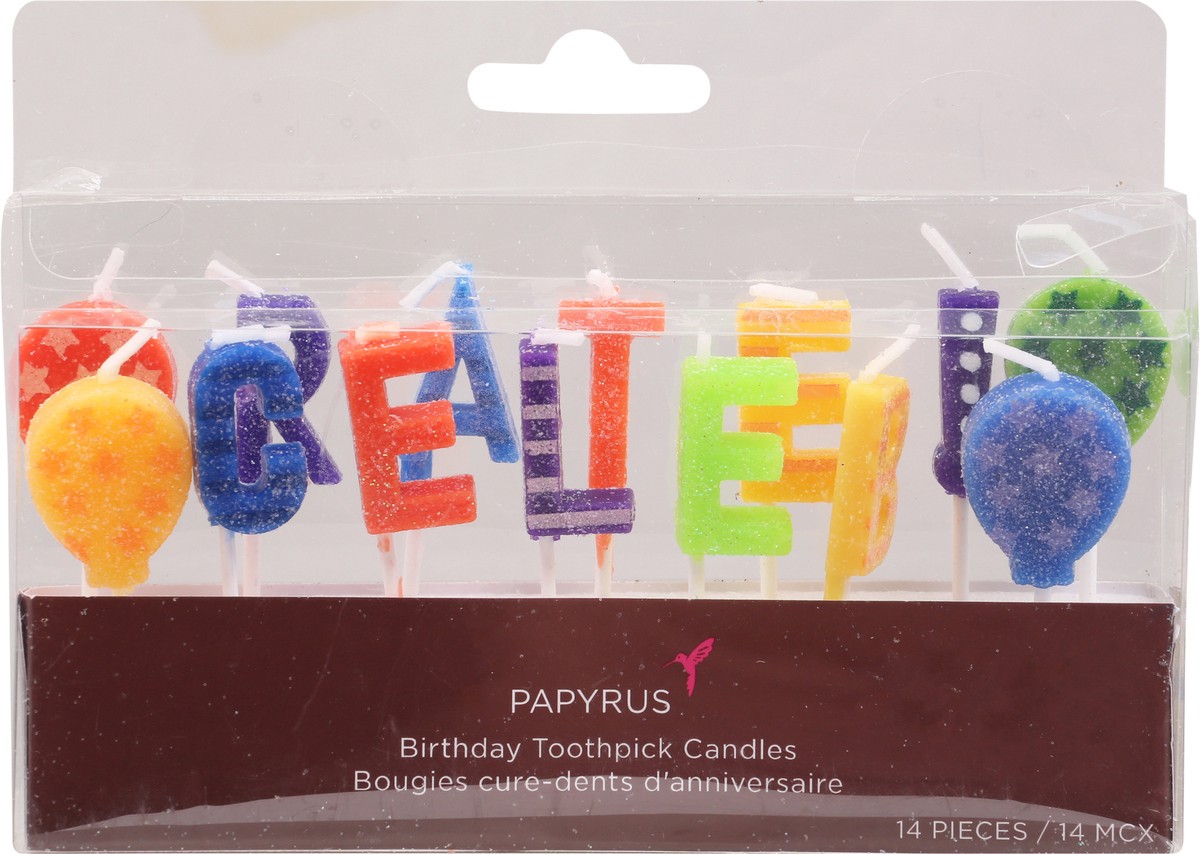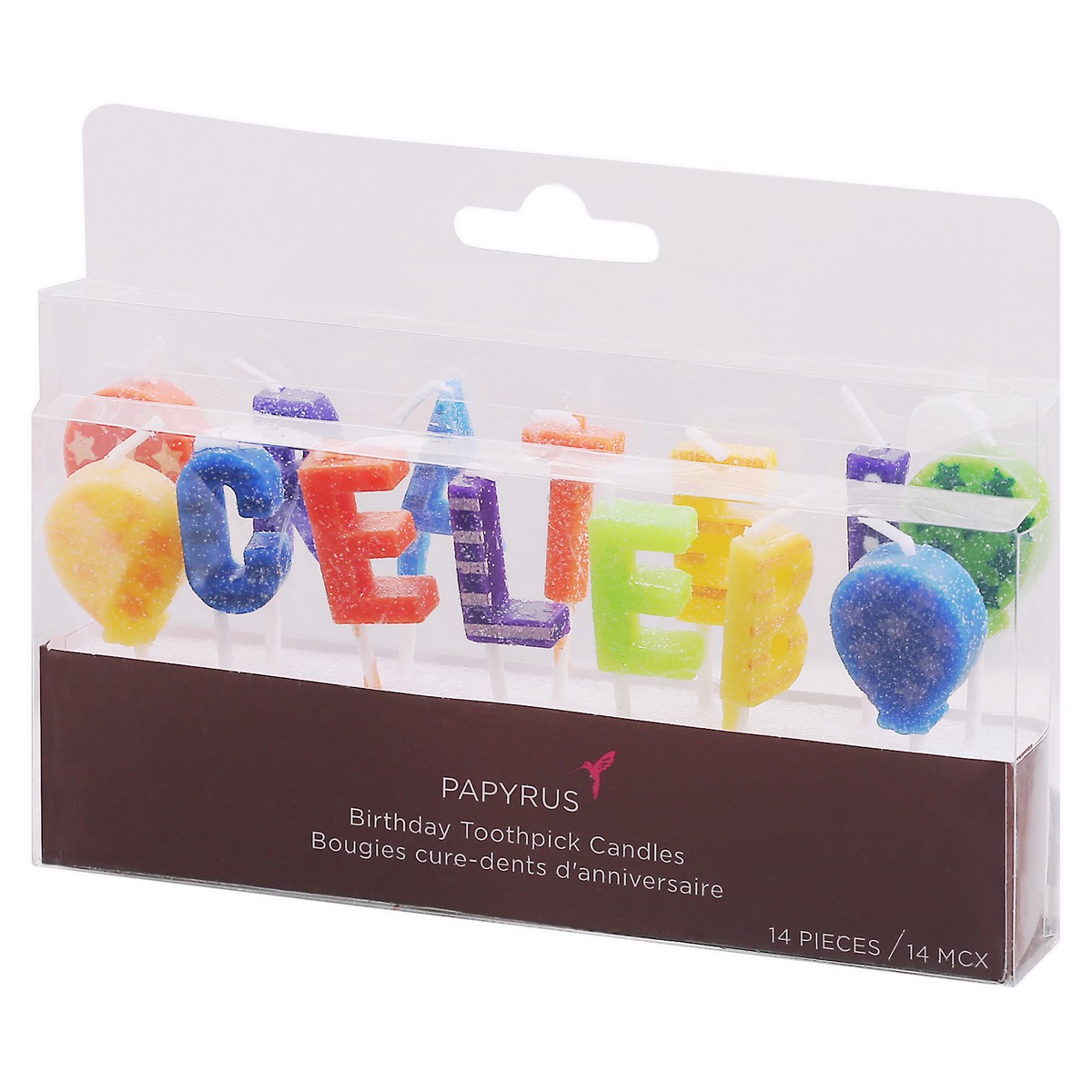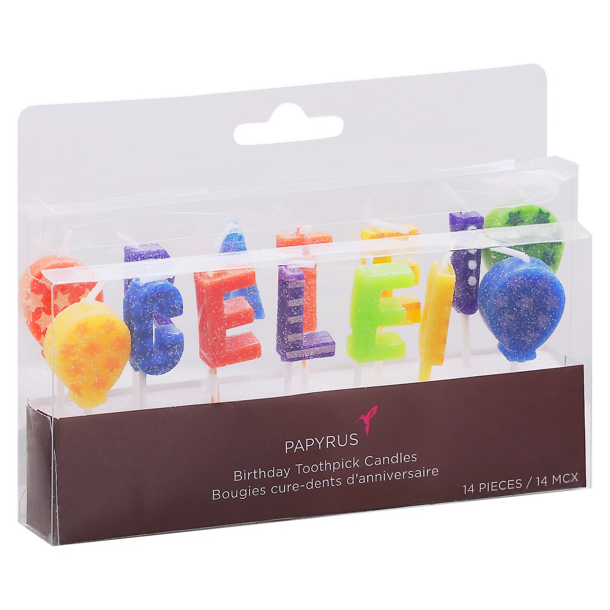 Light up the birthday cake and wish big with decorative candles by Papyrus This set of 14 toothpick glitter candles features colorful letters that spell Celebrate. Uniquely crafted with Papyrus style …