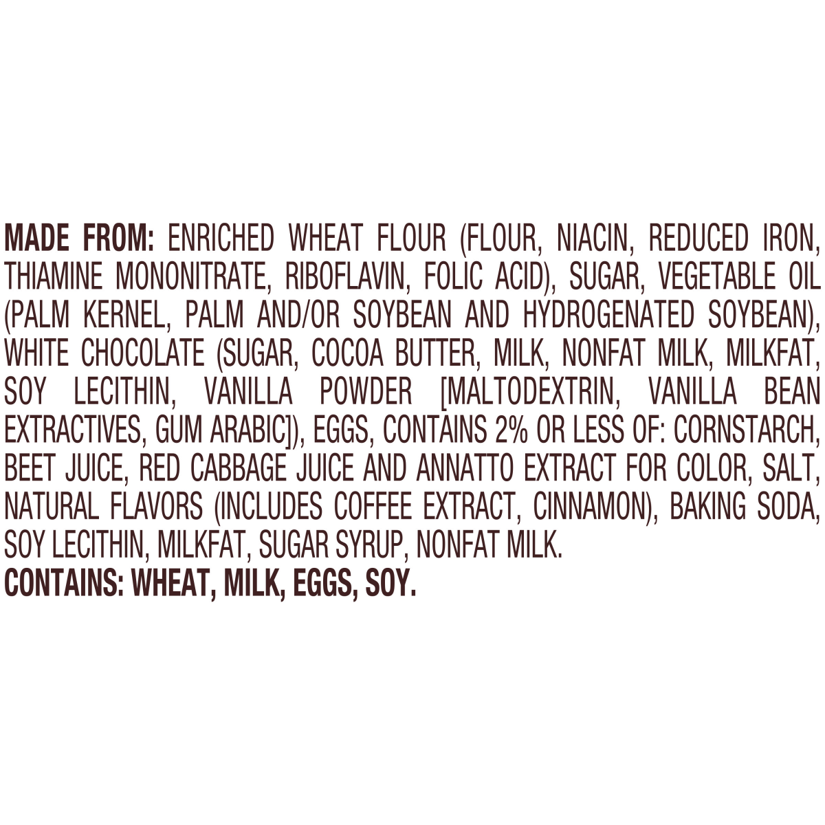 MADE FROM: ENRICHED WHEAT FLOUR (FLOUR, NIACIN, REDUCED IRON, THIAMINE MONONITRATE, RIBOFLAVIN, FOLIC ACID), SUGAR, VEGETABLE OIL (PALM KERNEL, PALM AND/OR SOYBEAN AND HYDROGENATED SOYBEAN), WHITE CHO…