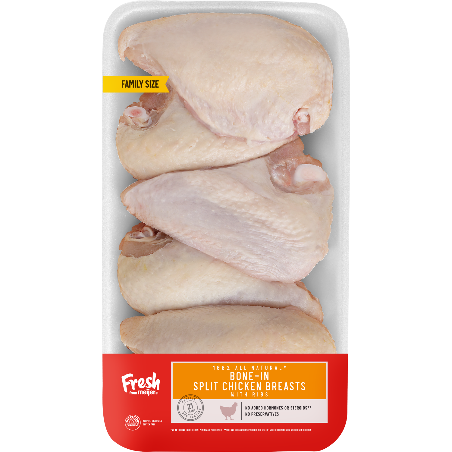 Enjoy the hearty flavor of Fresh from Meijer 100% All-Natural Bone-In Split Chicken Breasts, perfect for your family meals. These fresh chicken breasts contain no added hormones or preservatives, ensu…