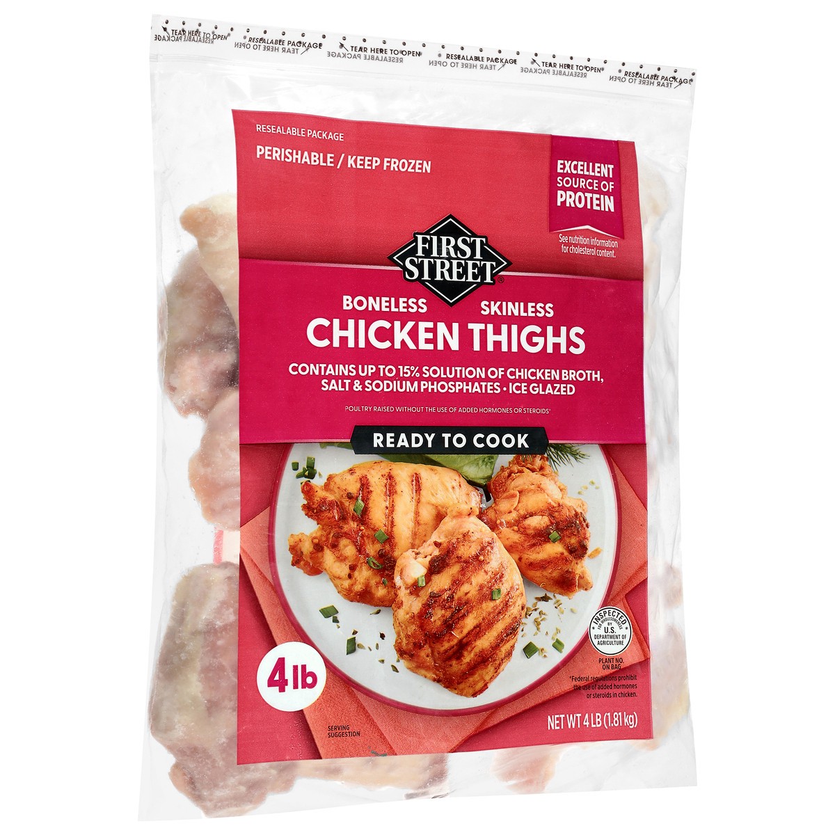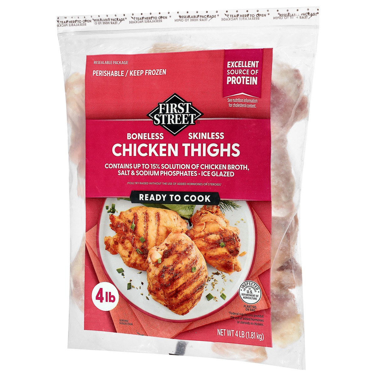 Uncooked Boneless Skinless Chicken Thighs, Chicken Broth, Salt, Sodium Phosphates.