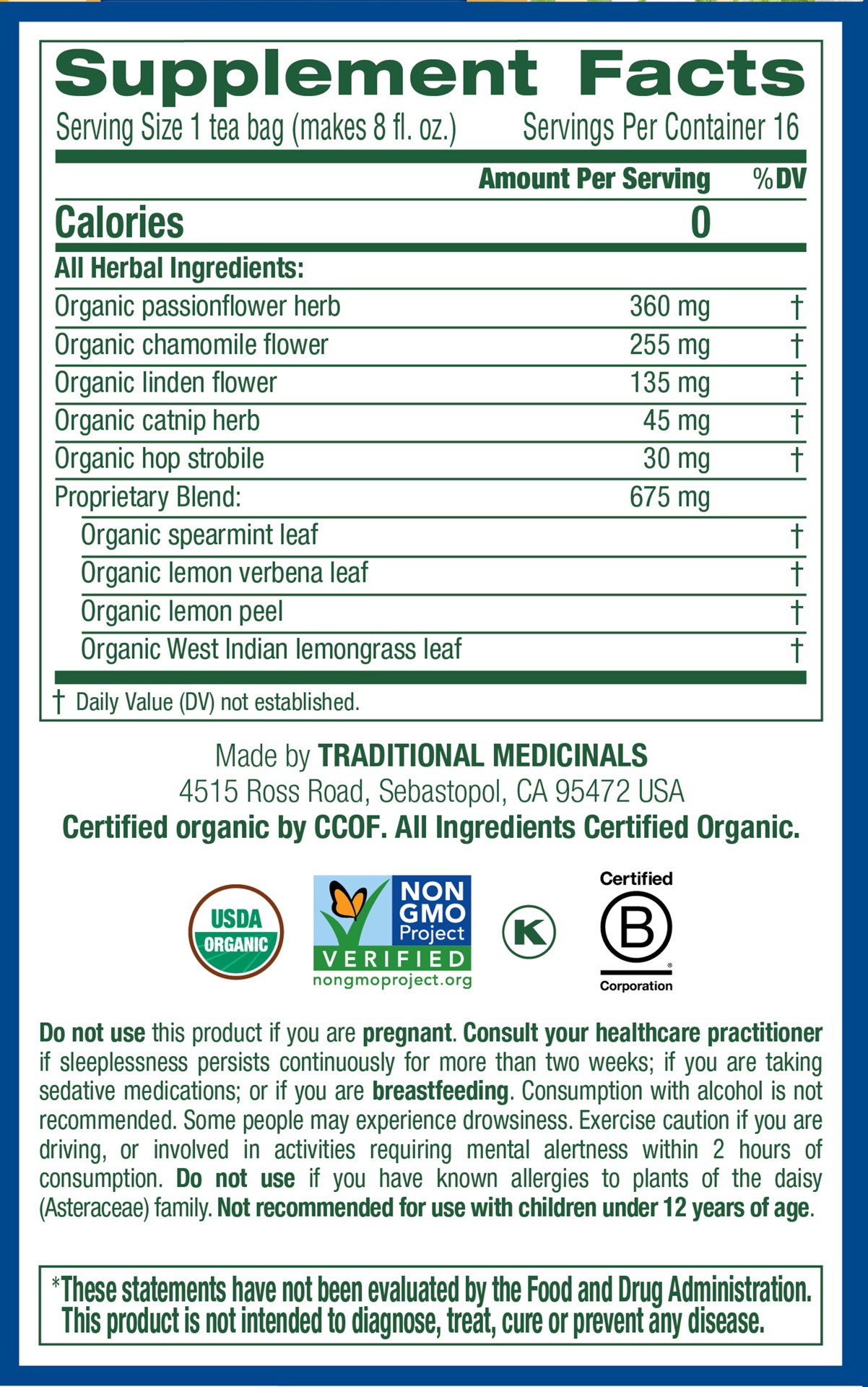 Organic passionflower herb, Organic chamomile flower, Organic linden flower, Organic catnip herb, Organic hop strobile, Organic spearmint leaf, Organic lemon verbena leaf, Organic lemon peel, Organic …