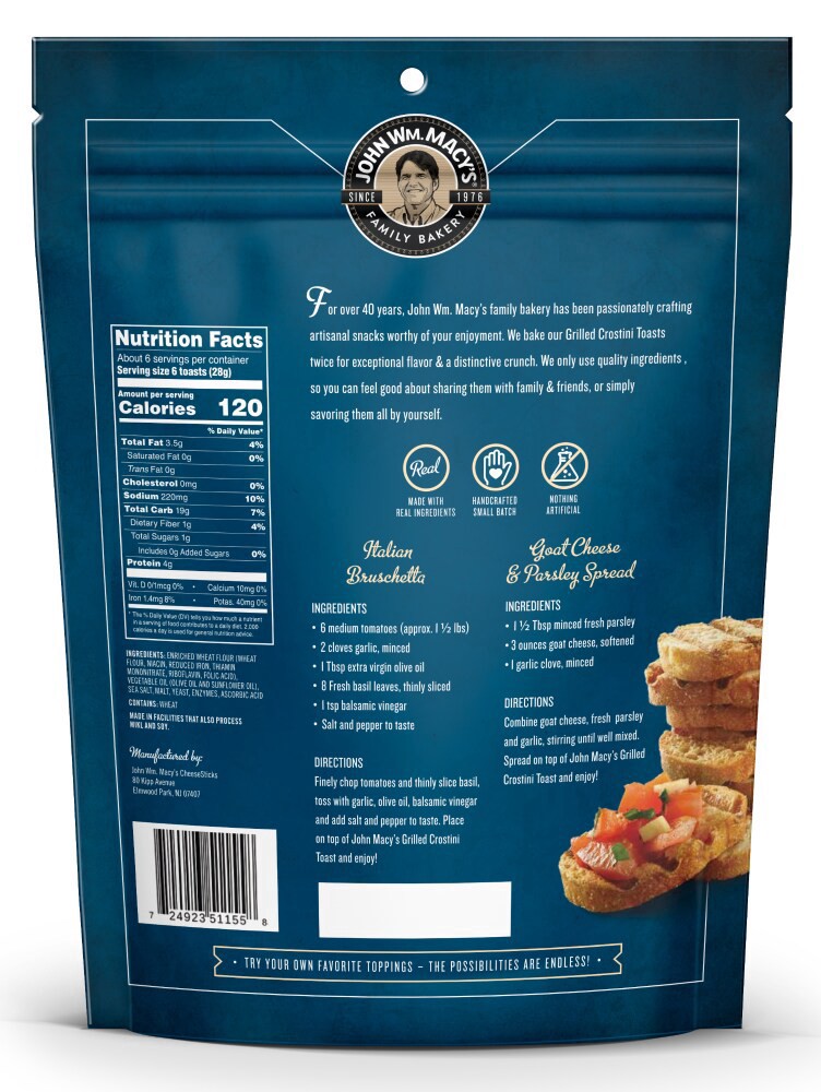The latest addition to our product line, Grilled Crostini Toasts are crafted from artisan sourdough baguettes which are sliced, grilled and seasoned with olive oil and sea salt, then baked again to "t…