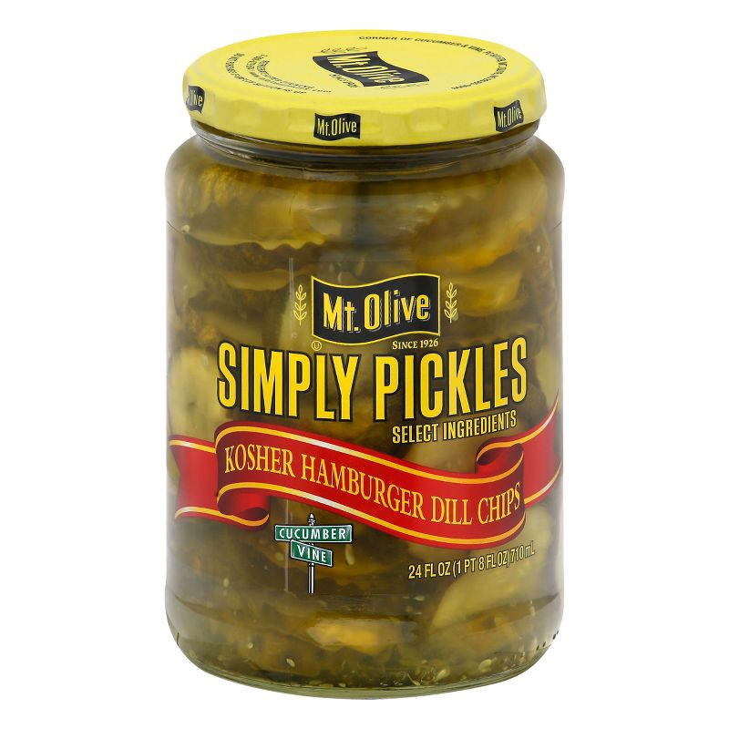- One 24 fl oz jar of Mt Olive Simply Pickles Hamburger Chips Kosher Dill Pickles