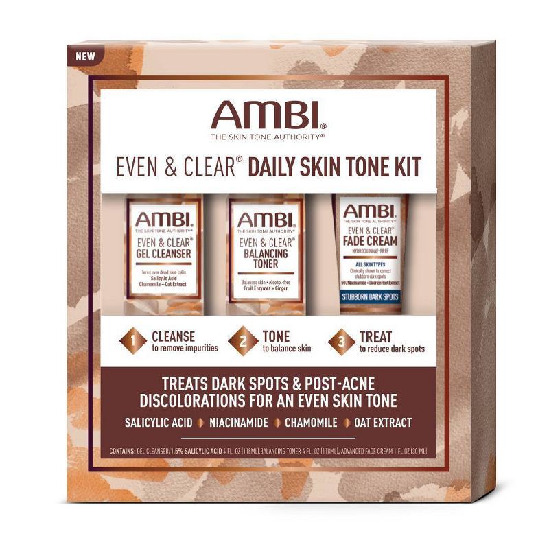 - NEW! Ambi Even & Clear Daily Skin Tone Kit, a daily 3-step acne and dark spot treatment system designed to deliver an even skin tone