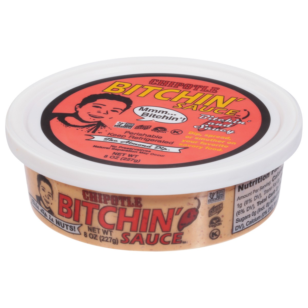 Mmm Bitchin''! Bitchin'' and saucy. Dip, spread or smother on your favorite savory food. The almond dip. Natural separation may occur. Family owned and operated. Made with love. No preservatives.