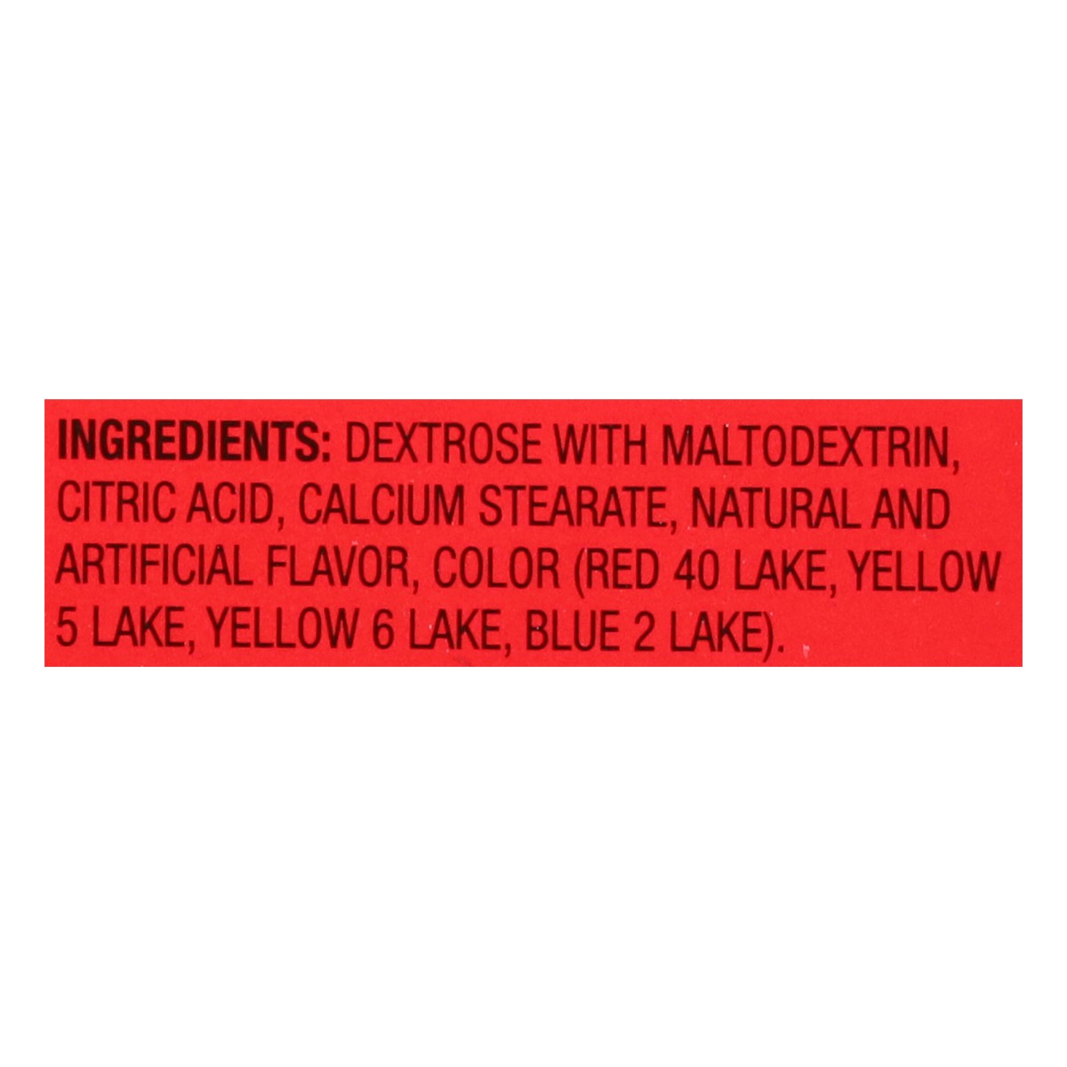 Dextrose with Maltodextrin, Citric Acid, Calcium Stearate, Natural and Artificial Flavor, Color (Red 40 Lake, Yellow 5 Lake, Yellow 6 Lake, Blue 2 Lake).