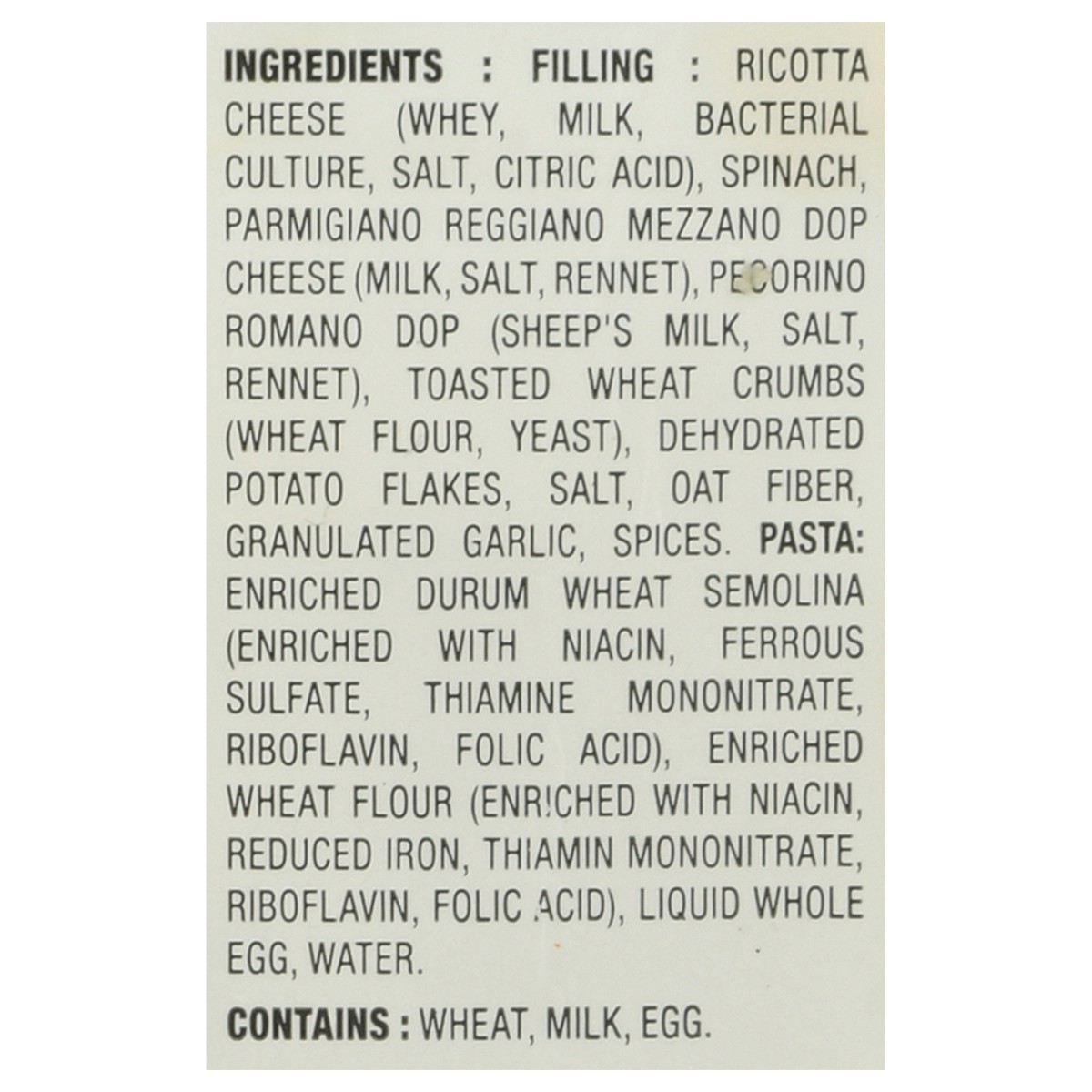 Ricotta Cheese (Whey, Milk, Bacterial Culture, Salt, Citric Acid), Spinach, Parmigiano Reggiano Mezzano Dop Cheese (Milk, Salt, Rennet), Pecorino Romano Dop (Sheep’s Milk, Salt, Rennet), Toasted Wheat…