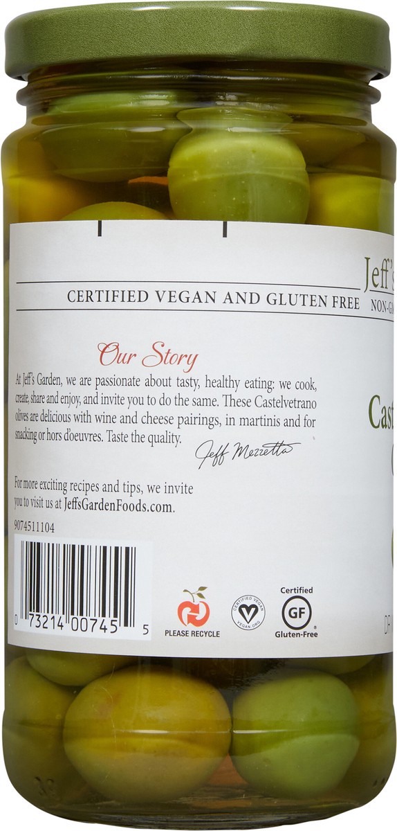No. 745. Our Story: At Jeff's Garden, we are passionate about tasty, healthy eating: we cook, create, share and enjoy, and invite you to do the same. These Castelvetrano olives are delicious with wine…