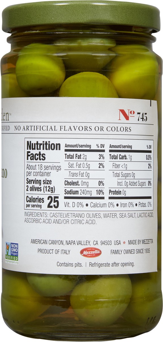 Castelvetrano Olives, Water, Sea Salt, Lactic Acid, Ascorbic Acid and/or Citric Acid.