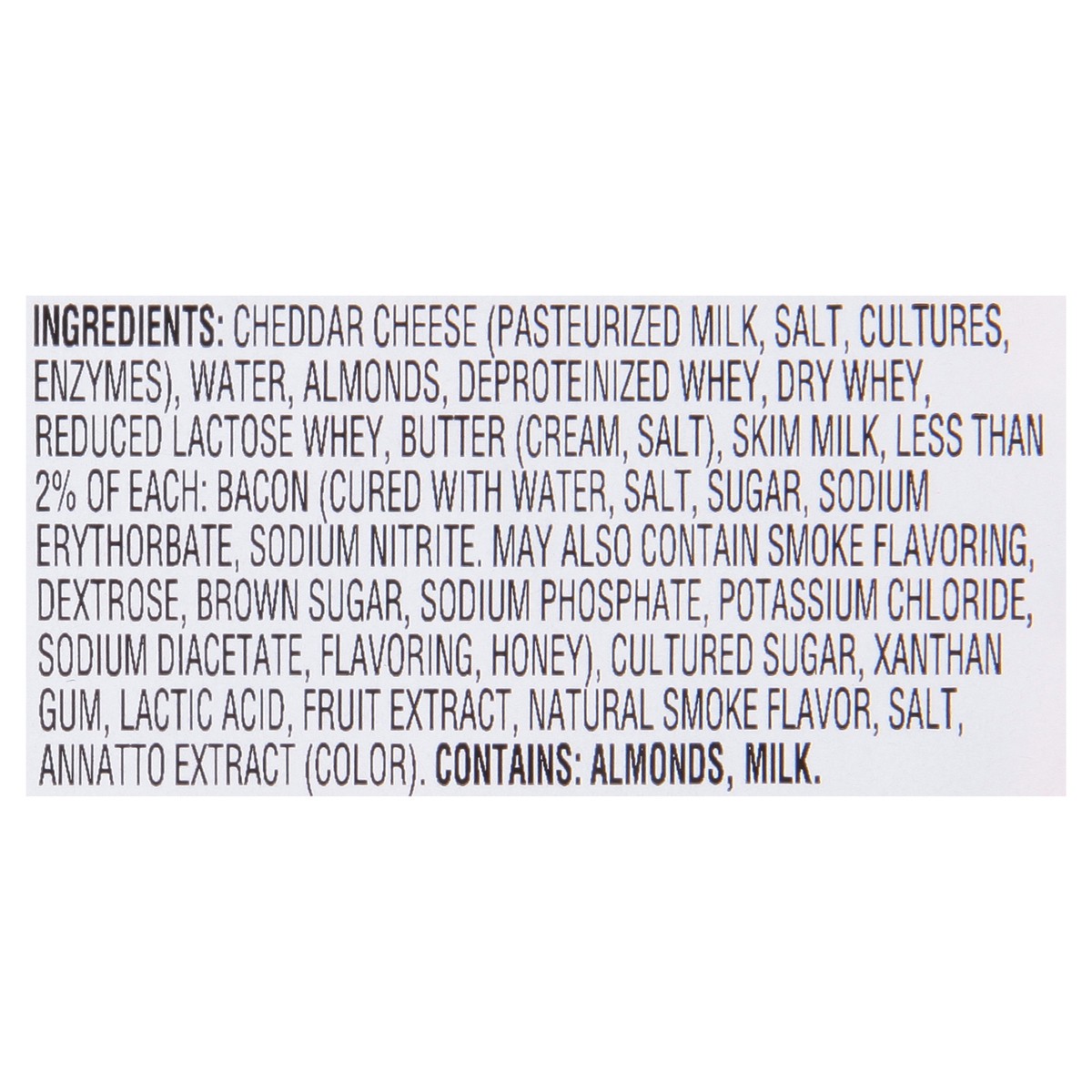 Cheddar Cheese (Pasteurized Milk, Salt, Cultures, Enzymes), Water, Almonds, Deproteinized Whey, Dry Whey, Reduced Lactose Whey, Butter (Cream, Salt), Skim Milk, Less than 2% of Each: Bacon (Cured with…