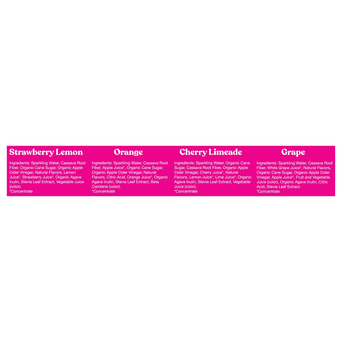 Strawberry Lemon: Sparkling Water, Organic Cane Sugar, Organic Apple Cider Vinegar, Organic Agave Inulin, Natural Flavors, Lemon Juice*, Strawberry Juice*, Stevia. *Concentrate. Orange: Sparkling Wate…