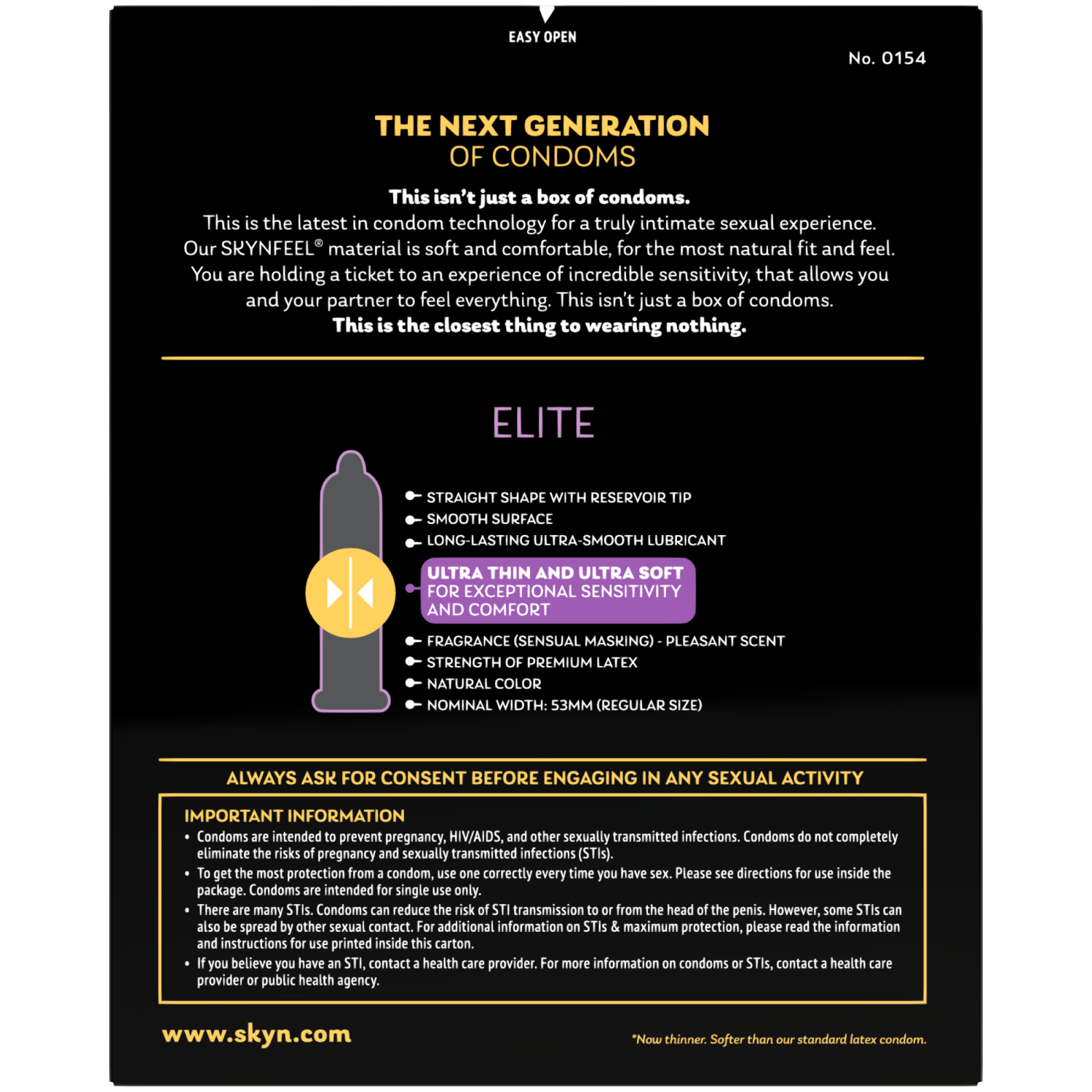 SKYN Elite Ultra Thin Premium Polyisoprene Lubricated Condoms are made with SKYNFEEL, a non-latex material that feels soft and natural. 15% thinner than our SKYN Original condoms, these condoms provid…