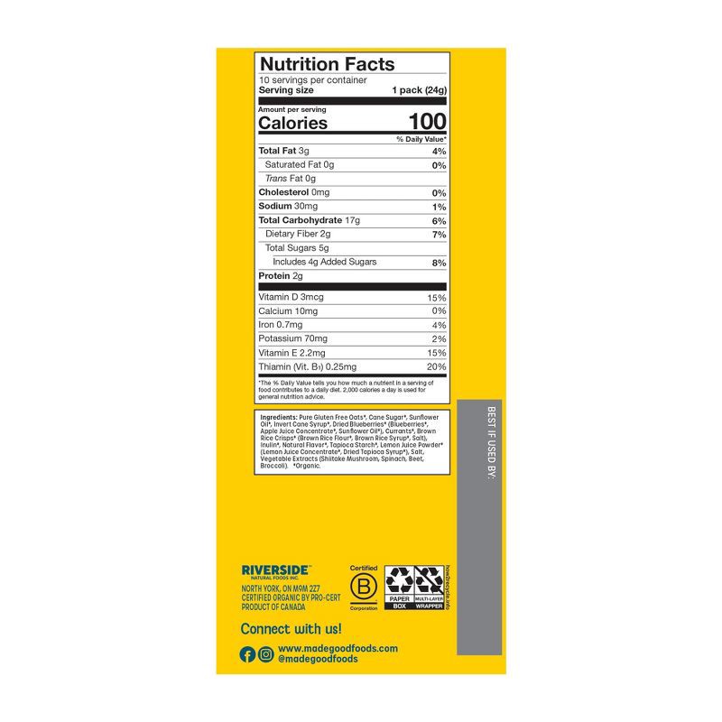 Bright, zesty lemon meets sweet, tangy blueberries in these delicious bite-sized granola bites. MadeGood Lemon Blueberry Bites are crafted with organic, gluten-free oats and real fruit pieces, deliver…