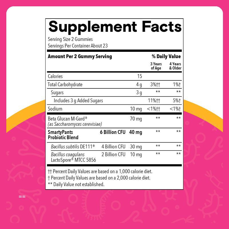 - DELICIOUS TASTE & KID-APPROVED: Strawberry Flavor with Other Natural Flavors. For children 3 years of age and older, take 2 gummies daily. May be taken with or without food. Chew each gummy thoroughly. May be taken as needed. May be paired with other SmartyPants formulas such as our multivitamins