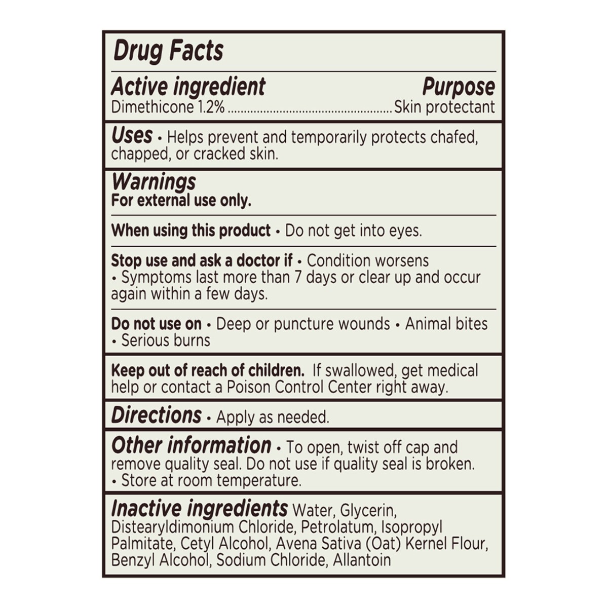 Active Ingredients: Dimethicone (1.2 %), Skin Protectant. Inactive Ingredients: Water, Glycerin, Distearyldimonium Chloride, Petrolatum, Isopropyl Palmitate, Cetyl Alcohol, Avena Sativa (Oat) Kernel F…