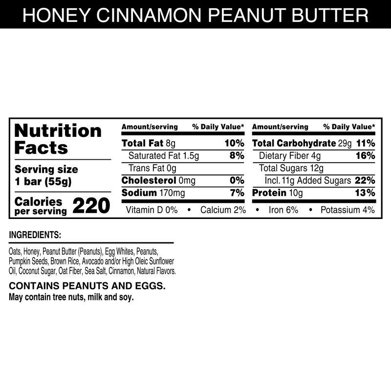 Oats, Honey, Peanut Butter (Peanuts), Egg Whites, Peanuts, Pumpkin Seeds, Brown Rice, Avocado and/or High Oleic Sunflower Oil, Coconut Sugar, Oat Fiber, Sea Salt, Cinnamon, Natural Flavors.