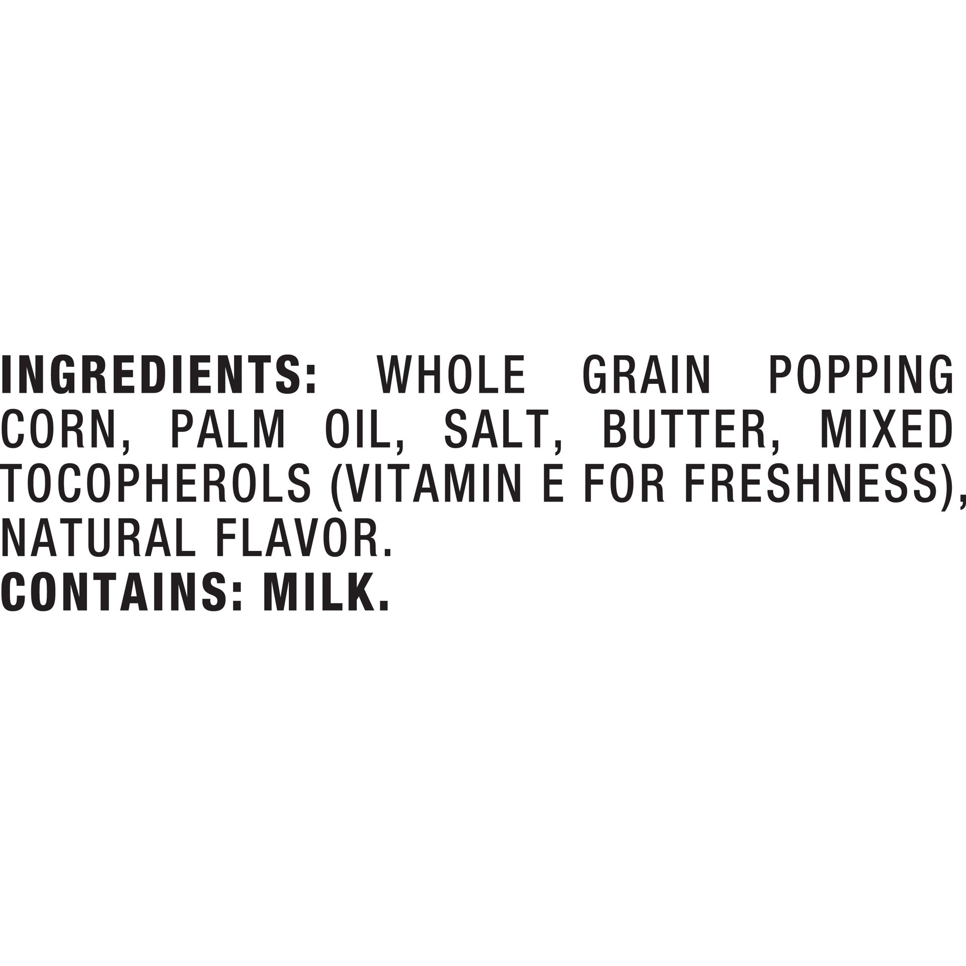 Whole Grain Popping Corn, Palm Oil, Salt, Butter, Mixed Tocopherols (Vitamin E for Freshness), Natural Flavor.
