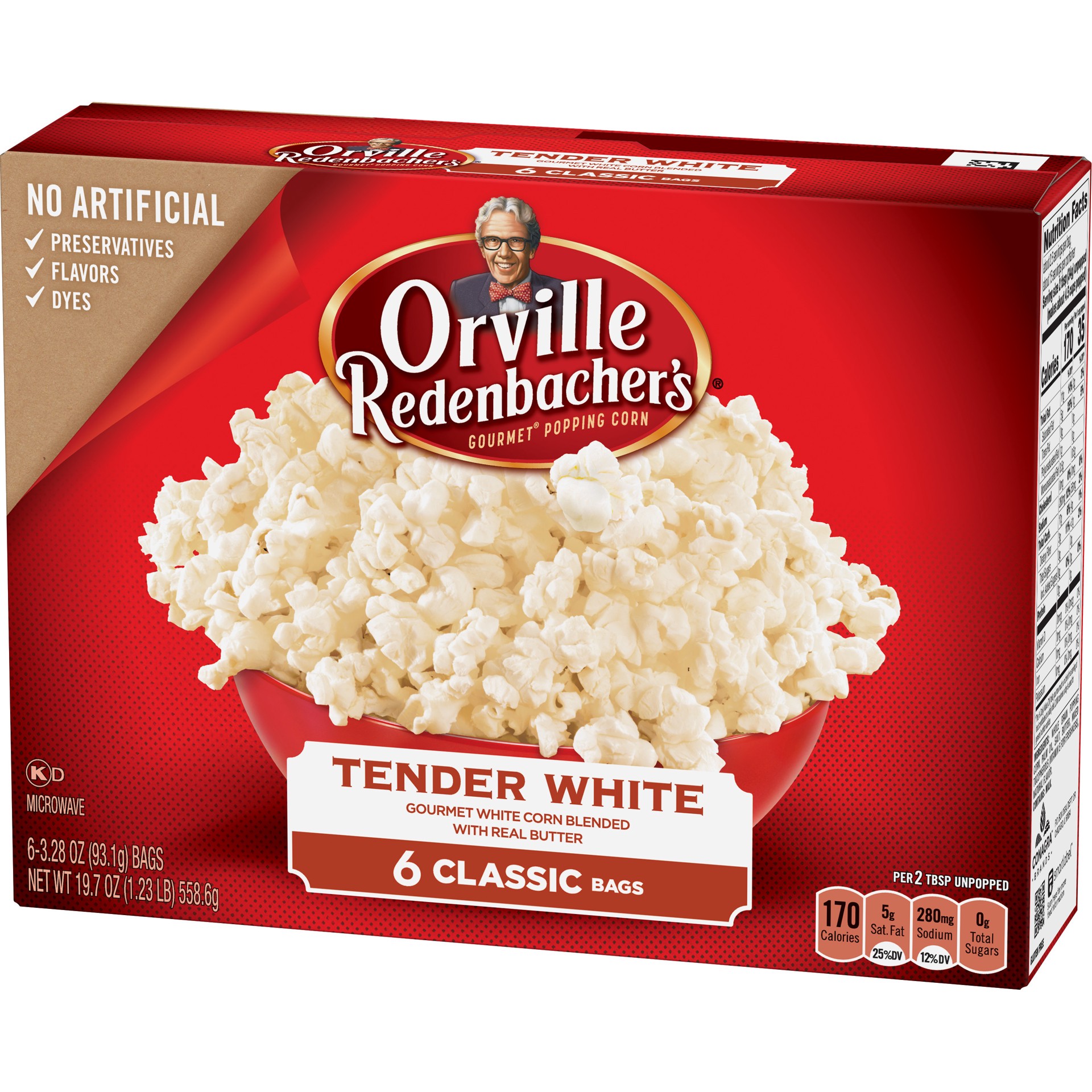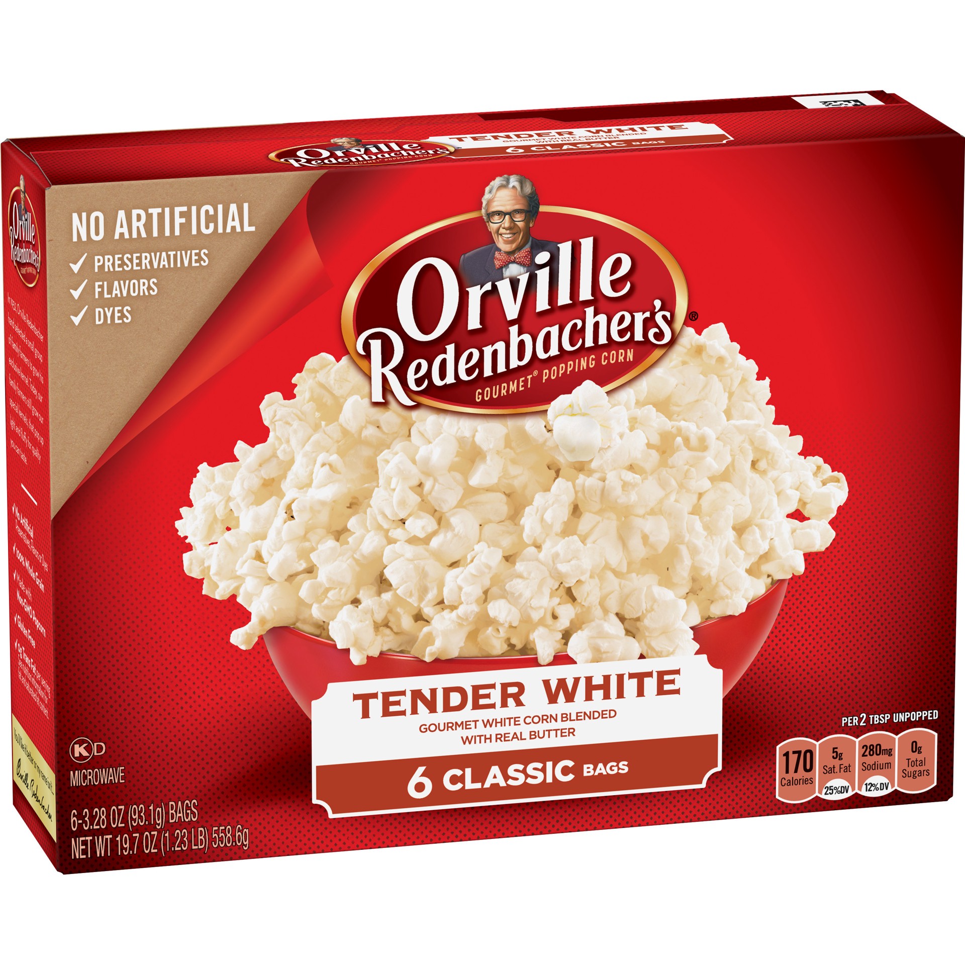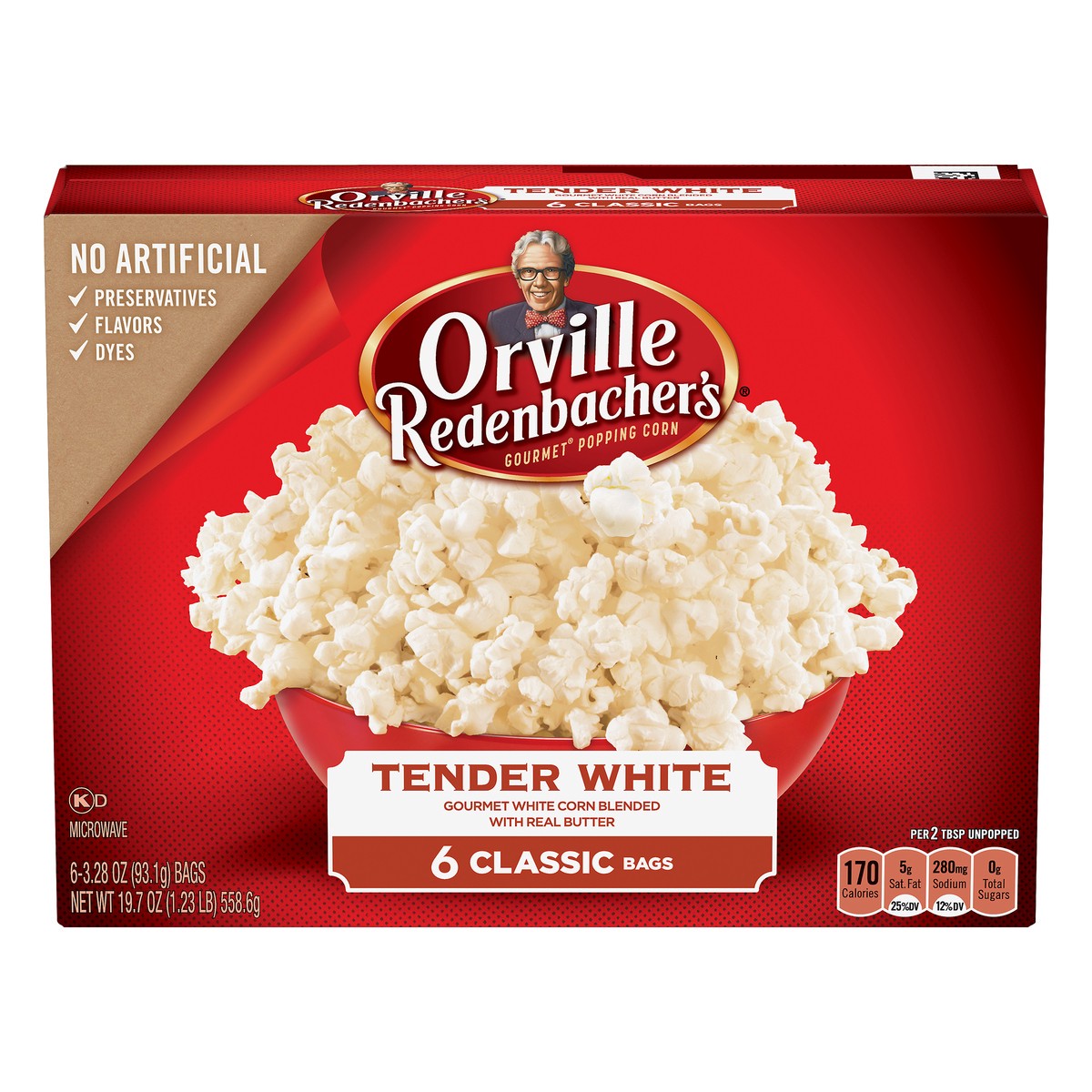 Gourmet white corn blended with real butter. No artificial flavors. Per 2 Tbsp Unpopped: 170 calories; 5 g saturated fat (25% DV); 280 mg sodium (12% DV); 0 g total sugars. 0 g trans fat per serving. …