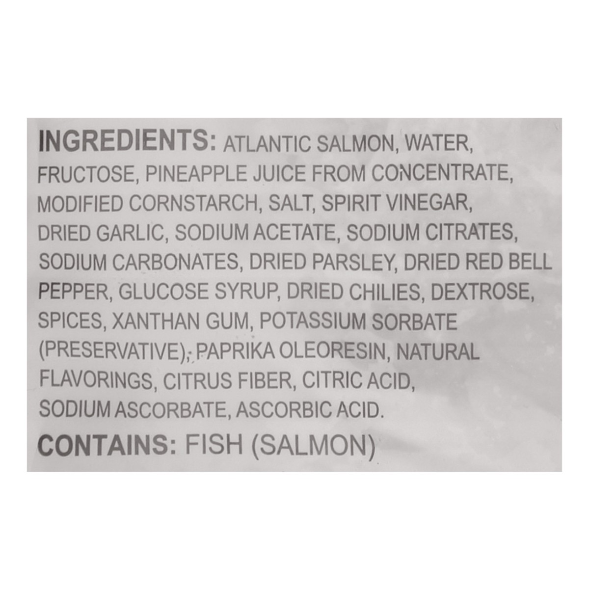 Atlantic Salmon, Water, Fructose, Pineapple Juice from Concentrate, Modified Cornstarch, Salt, Spirit Vinegar, Dried Garlic, Sodium Acetate, Sodium Citrates, Sodium Carbonates, Dried Parsley, Dried Re…
