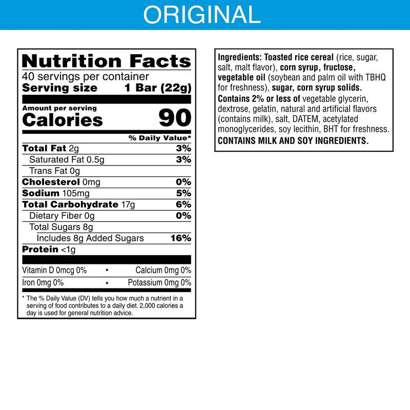- Discover sweet flavor and crispy texture; 90 calories per bar; No high fructose corn syrup; Contains milk and soy ingredients