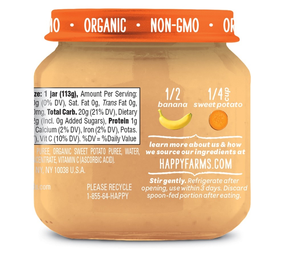 Organic Banana Puree, Organic Sweet Potato Puree, Water, <2% of: Organic Lemon Juice Concentrate, Ascorbic Acid (Vitamin C).